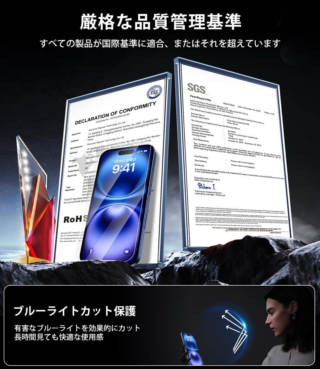 【高透明・細部まで鮮明】当社のiPhone 16 用強化ガラス保護フィルムは、モスアイ精密構造技術を採用し、ディスプレイの色彩や細部を完璧に再現します。直射日光下でも鮮明さとシャープさを確保します。新しい高透過率素材は、99.99%の高い光透過率を実現し、超クリアな視覚効果を提供します。また、防反射とブルーライトカットコーティングにより、有害な青色光と紫外線を効果的にカットし、網膜への潜在的なダメージを軽減し、長時間の使用による目の疲れを和らげます。革新的なナノ抗菌層は、99.9%の細菌の付着を抑制し、RoHS環境基準にも準拠しており、健康と高画質な体験を両立させています。