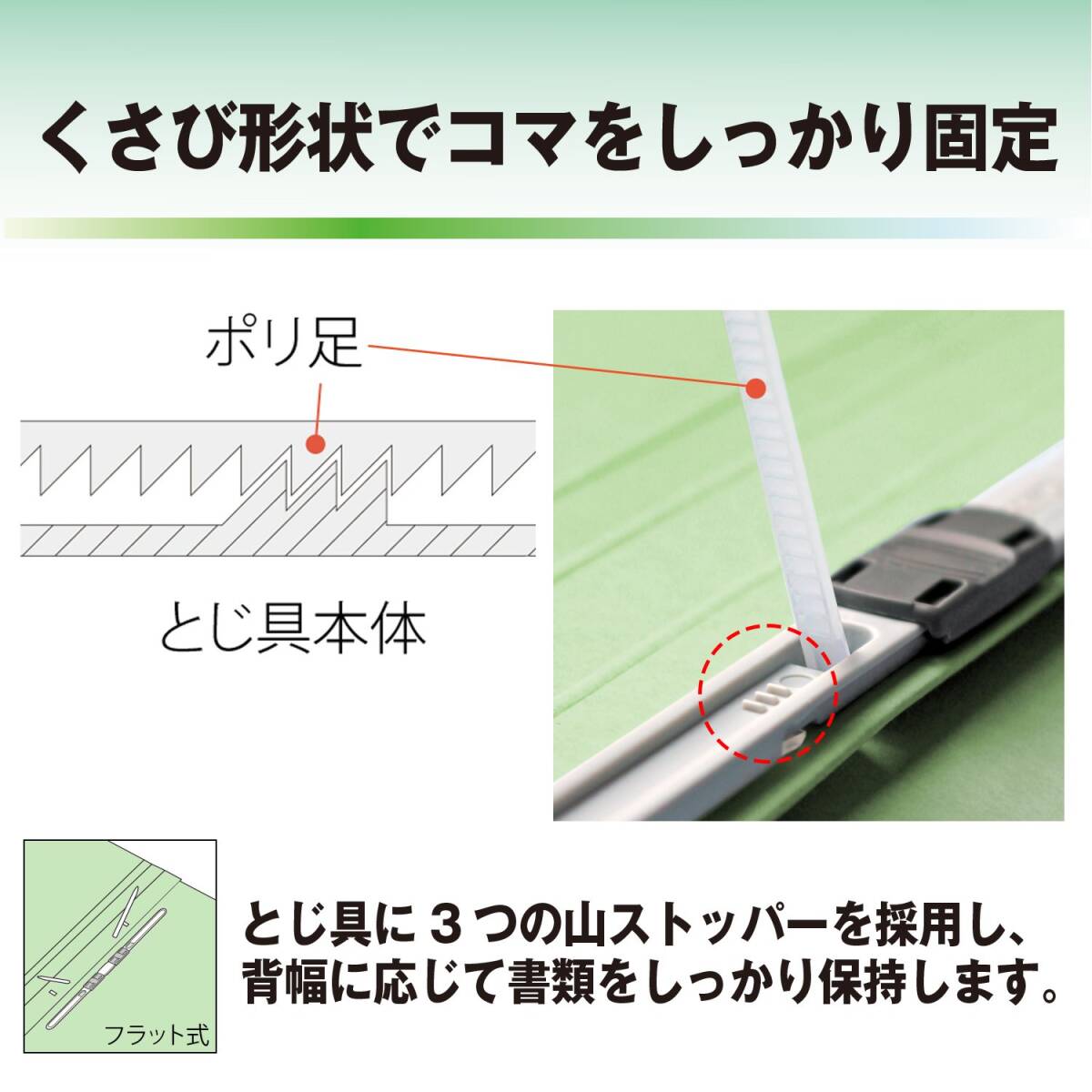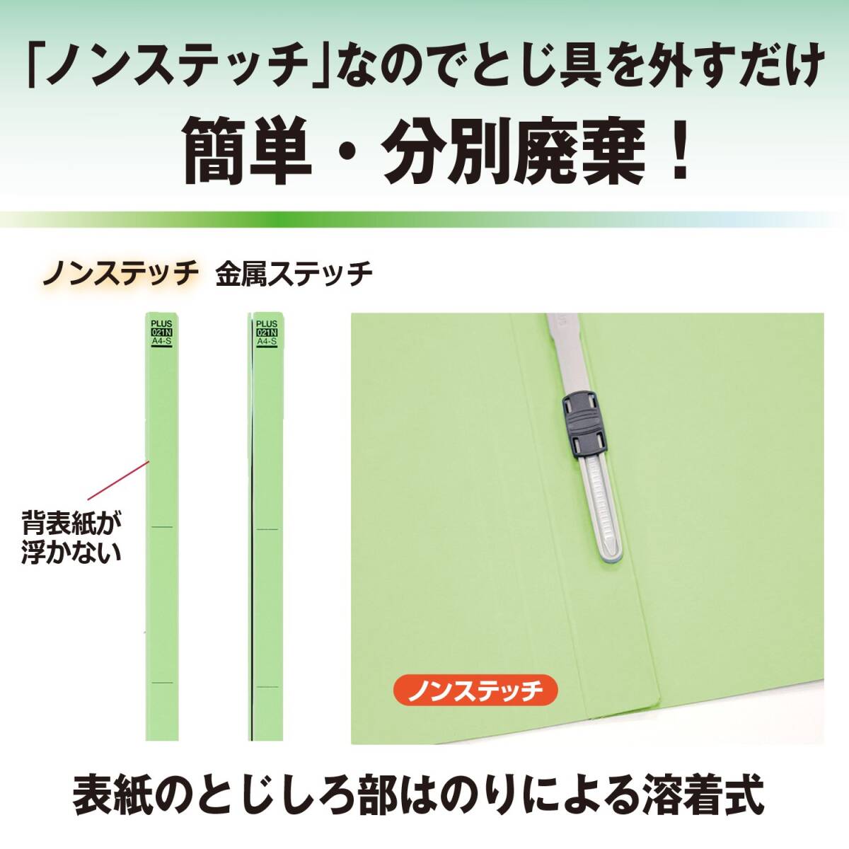 ●ノンステッチ:表紙とじしろ部の金具ステッチを無くし、のりによる接着式に変更しました。針の取り外しがいらない簡単分別を実現。背表紙の浮きもなくなり、さらにスリムにすっきりと収納できます。