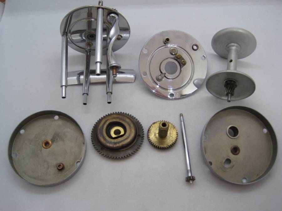 -サイドプレートやめっきされたパーツ、ギヤ類は真鍮製でやや重いですが、スプールはアルミ製ですので、ハンドルを回した時の感触は軽やかです。