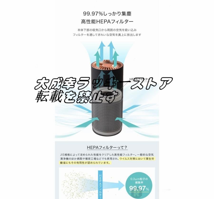 本空気清浄機は高効能フィルターを採用。大きな粒子(毛やホコリなど)を捕集しHPAEフィルターは99.97%の0.3μm以上の微粒子を濾過し活性炭フィルターは各種の臭いと有害なガスを除去。対応畳数:10畳