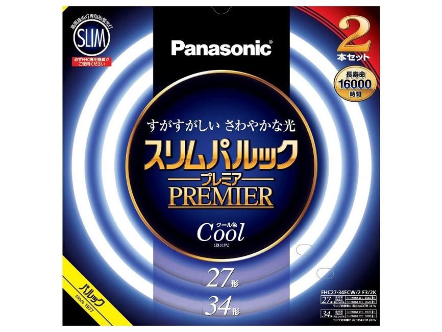 27形+34形・クール色 27形+34形 FHC2734ECW2F32K・色鮮やかRa84・用途に応じて選べる3光色・約16000時間の長寿命を実現・管径16mmのスリムなガラス管を採用・口金: GZ10q●光色 :クール色(昼光色) ●寸法 :ガラス管径 27形:16mm34形:16mm ●外径/内径: 27形:299/266mm34形:373/340mm ●質量: 27形:115g 34形:147g●口金: GZ10q ●定格ランプ電力※1: 27形:27.0/38.0W34形:34.0/48.0W ●ランプ電流※1: 27形:0.215/0.360A34形:0.215/0.360A ●全光束: 周囲温度25℃※1 27形:2170/3020lm34形:2700/3800lm●周囲温度:35℃※1 27形:2340/3080lm●色温度: 6700K ※1左側は定格点灯時、右側は高出力点灯時の値を示します