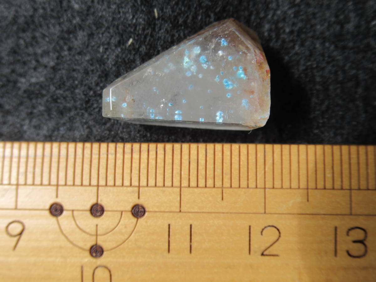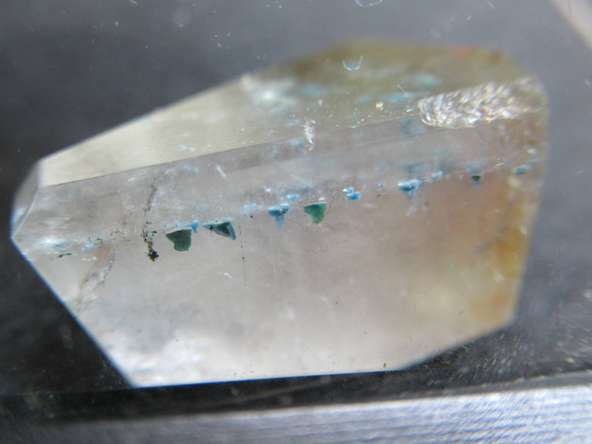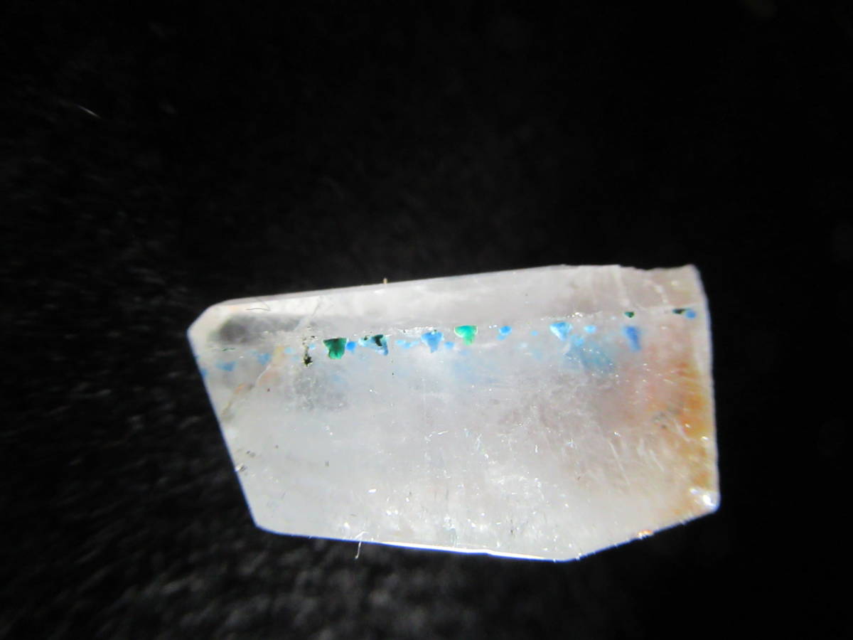 ブラジルMinasGerais州パライバ・パライソ産のギラライトを含むいわゆるパライバ水晶。本品ではブルーの他にグリーンのギラライトを含みます。ギラライト群は水晶中の1平面に分布していて、ある断面で見ると一直線に並んで見えます(画像1と10)。ギラライト粒は基本的にマリモ様で径1から2mmで中心部から放射状に針状結晶が集合しているようです。欠点として4mm長の欠けがあります(画像10ほか)。全体サイズ19/8/5mm、重さ3,6g。送料無料。