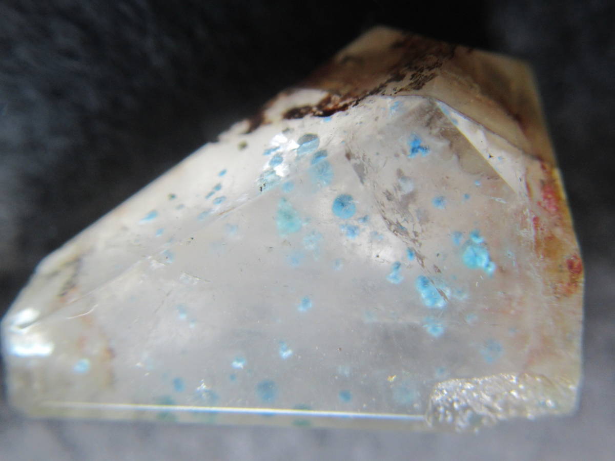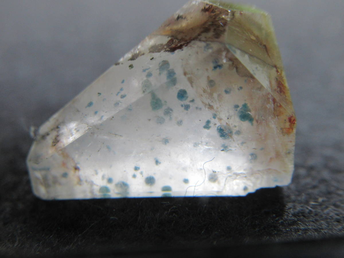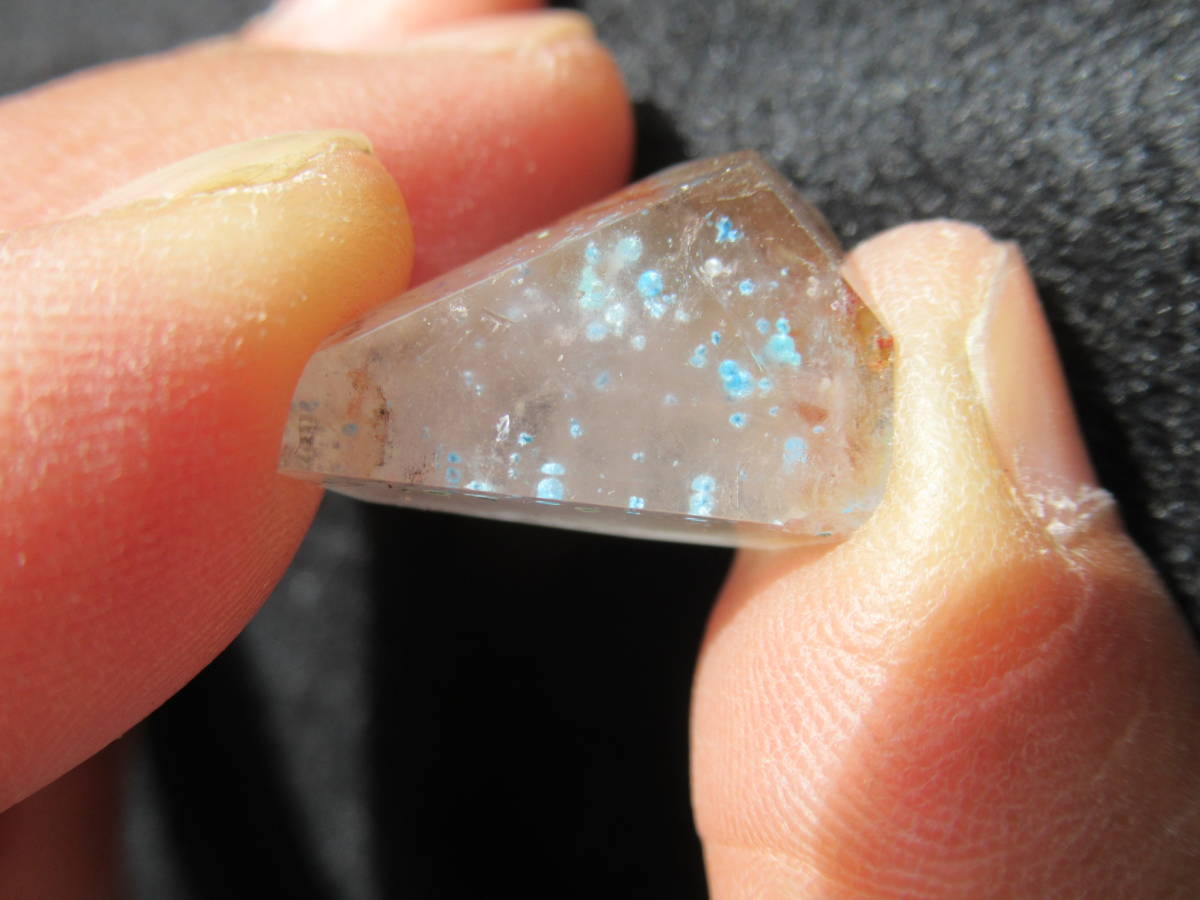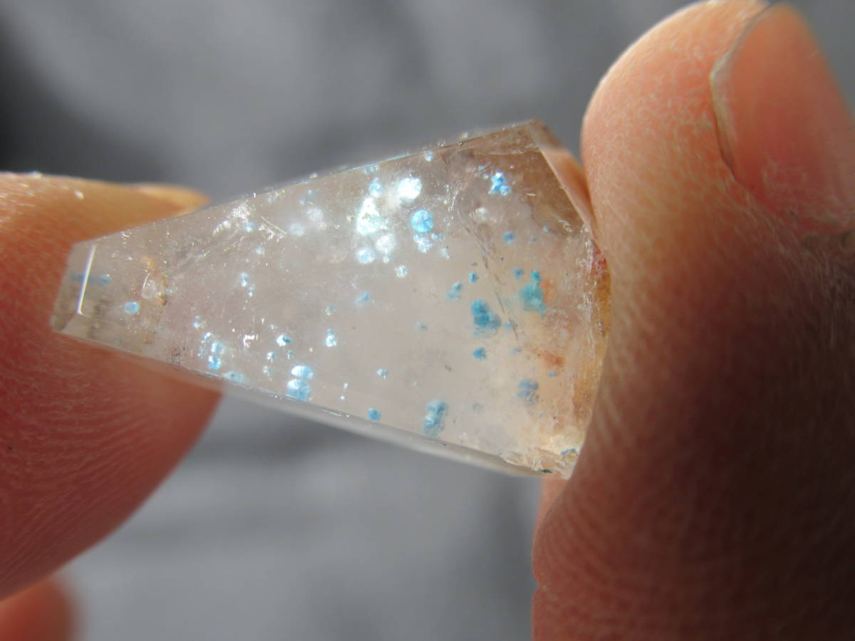 ブラジルMinasGerais州パライバ・パライソ産のギラライトを含むいわゆるパライバ水晶。本品ではブルーの他にグリーンのギラライトを含みます。ギラライト群は水晶中の1平面に分布していて、ある断面で見ると一直線に並んで見えます(画像1と10)。ギラライト粒は基本的にマリモ様で径1から2mmで中心部から放射状に針状結晶が集合しているようです。欠点として4mm長の欠けがあります(画像10ほか)。全体サイズ19/8/5mm、重さ3,6g。送料無料。