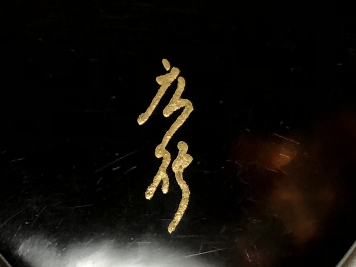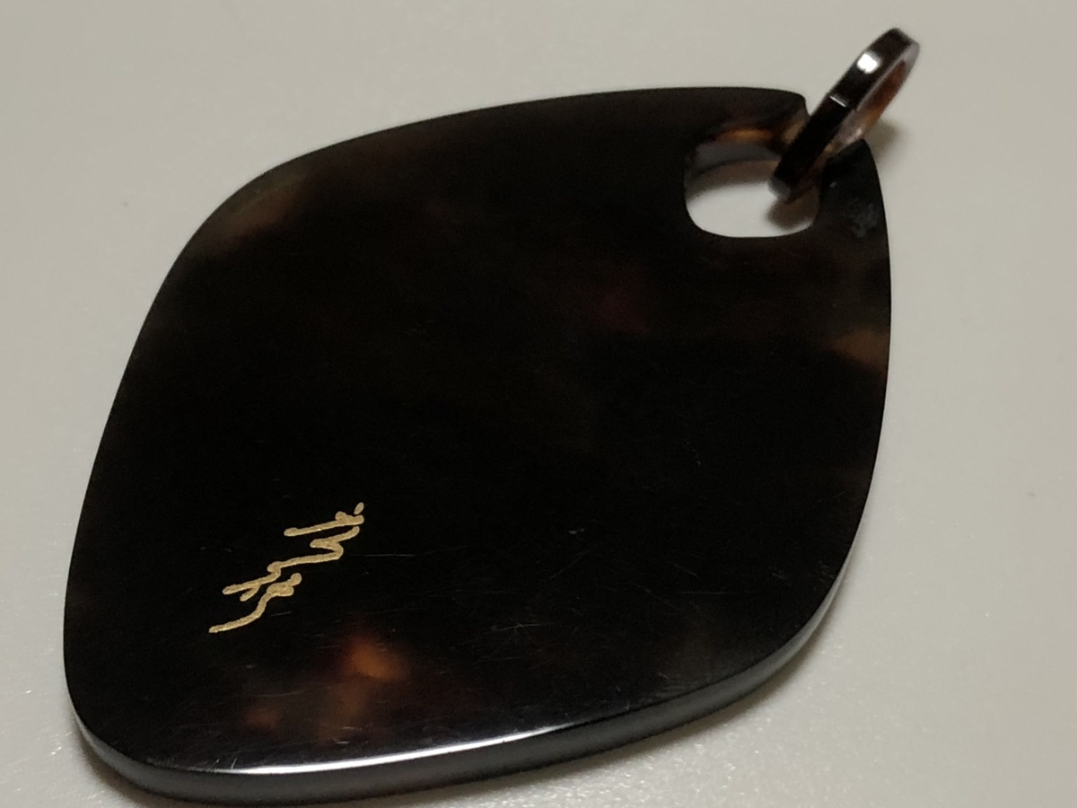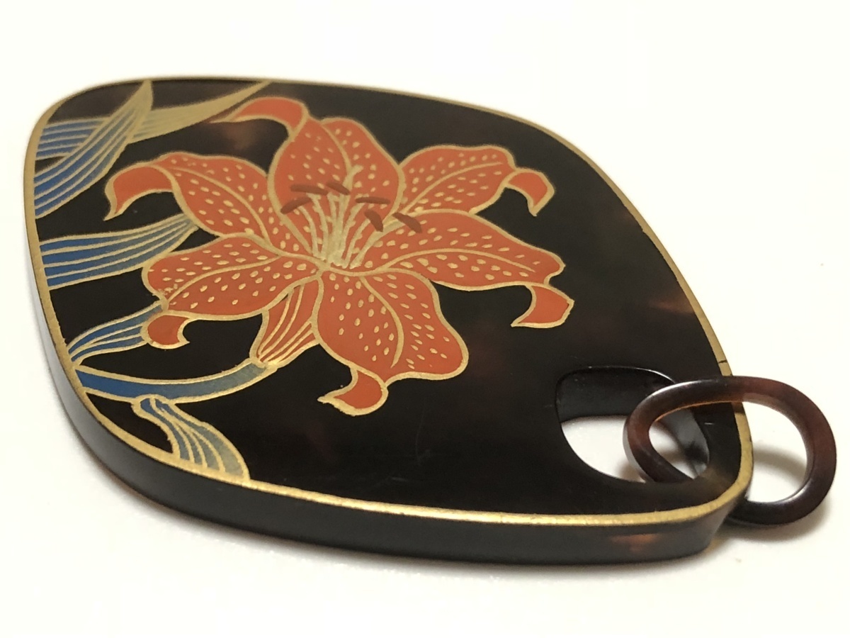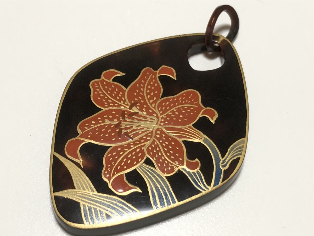 本鼈甲を使用し、金蒔絵を施した、大振りのハイビスカス文のペンダントトップです。作者、広行の銘があります。鼈甲部分に欠けや虫食いはありません。