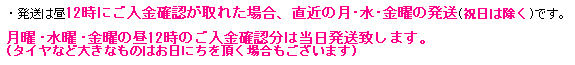 振込後、2日(土日祝を除く)経って発送連絡が無い場合は、振込エラーや名義間違いになっている可能性がありますので、お手数ですがご連絡ください。