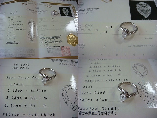 | ご覧頂きましてありがとうございます! ペアシェーブカットの高級のダイヤモンドリングです。サイズは約12です。プラチナ製。 ペアシェブダイヤは1、00カラットです。 カラーはE。クラリティーSI1です。重さは約9,3gです。鑑定書付き。 追加画像がありますのでパソコンでご確認ください。 宝石との出会いは一期一会です。『いいな』と思ったら是非、身につけてあげて下さい。きっと宝石も喜ぶことでしょう! 宝石は決して貴女を裏切りません。身につけた貴女を守ってくれることでしょう。 いつも頑張っている自分へのご褒美にいかがでしょうか? 良いものをひとつお持ち下さい。一生物のジュエリーとなります。 画像での判断は難しいと思いますが、落札後の返品、クレーム等の無きよう、ご自分の自己責任においてご入札下さい。 モニター、パソコン、カメラによって色や感じ方が変わりますのでご注意下さい。 商品についてはコレクター、質屋さん、お客様の委託品が中心ですので、ご質問の答えが遅くなる事がありますがご了承下さい。 商品説明につきましてはすべてをお知らせできませんので、質問にてお願いいたします。 基本的にはUSED品ですので、その点を十分にご理解の上ご入札下さい。 途中で出品を取り下げる場合もありますがご了承下さい。 尚、トラブル回避の為、申し訳ございませんが、新規の方及び評価によってはこちらで入札を削除させていただく場合もございますが、ご理解下さい。 メールの確認は夜になりますのでご連絡が遅くなることもありますがご了承願います。 品物にも人と同じように『こころ』があると思います。喜んでいただけることが私にとっても品物にとっても一番良いことだと思います。 『落札したけど気に入らなかった』ということが無いように十分にお考えになってからご入札下さい。 発送は宅配便を予定しております。また発送には2,3日かかる場合もございますが、ご了承願います。 お互いに気持ちよい取引のため、落札後3日以内のご連絡、5日以内のご入金頂けない場合は申し訳ございませんが取り消しさせていただきます。 落札金額より僅かですが『子ども虐待防止 オレンジリボン運動』へ寄付をさせていただきますがご了承お願いいたします。 | |