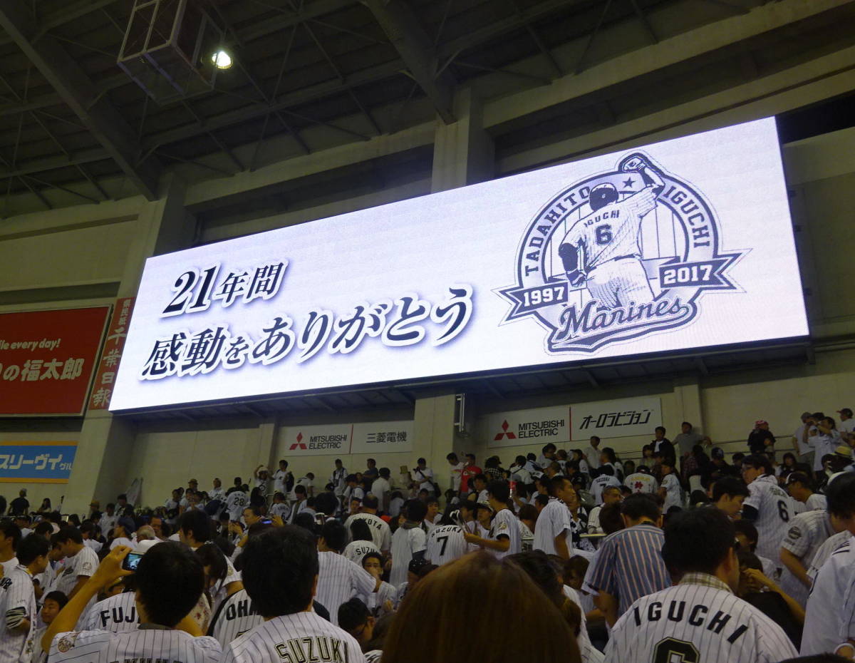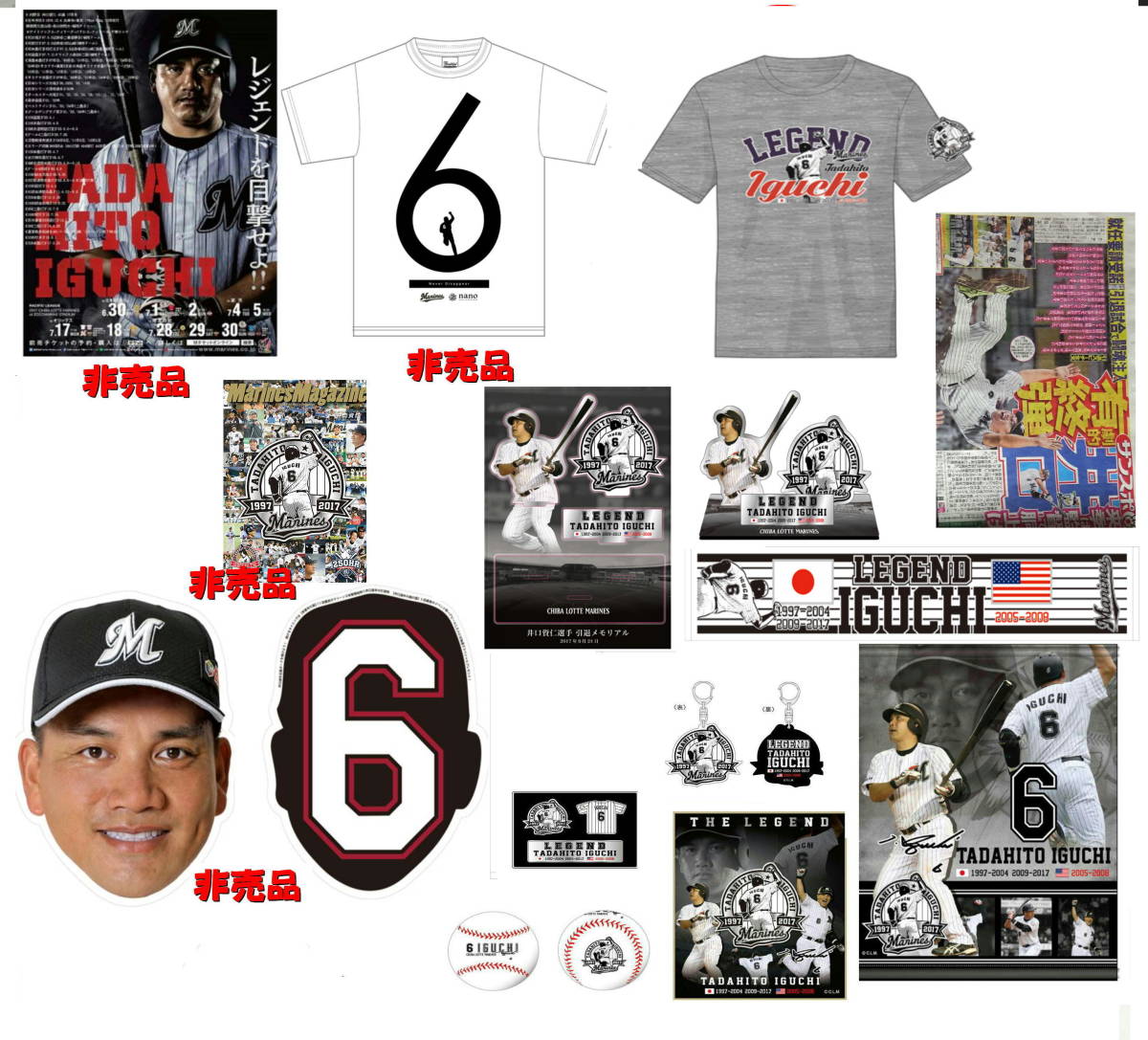 ①井口選手引退グッズ Tシャツ(グレー)XLサイズ ②井口選手引退グッズ 組み立て式アクリルスタンド ③井口選手引退グッズ サインボール ④井口選手引退グッズ タペストリー ⑤井口選手引退グッズ フォトサイン色紙 ⑥井口選手引退グッズ マフラータオル ⑦井口選手引退グッズ ピンズセット ⑧井口選手引退グッズ アクリルキーホルダー ⑨井口選手引退 一面記事スポーツ新聞(サンスポ) ⑩井口選手引退企画「マリーンズTシャツ produced by ZOZOTOWN」 9/10(日)先着2万名配布の来場者特典の非売品 ⑪井口選手顔型応援ボード 引退試合9/24(日)来場者特典の非売品 ⑫「MarinesMagazine 井口資仁選手引退特別号」 9/24(日)来場者特典の非売品 ⑬2017年7月球団日程ポスター(井口選手)「レジェンドを目撃せよ!」 非売品 ※上記①~⑬の合計13点セット 9/23(土)24(日)井口資仁選手引退グッズ販売情報!! 商品状態:新品未使用品・・・(未使用品) ※井口選手顔型応援ボードは球場で使用しましたので中古扱いとなります ※球場販売品の為持ち帰る際にできたしわ等ある場合があります ※現物の写真を掲載してありますので状態判断してください ※ 細部までのチェック不足により上記に該当する場合もありますので予めご了承お願いいたします サイズは添付写真にて判断してください。 ※添付写真背景の黒(又は白)正方形は約15㎝×15㎝です | ||||
