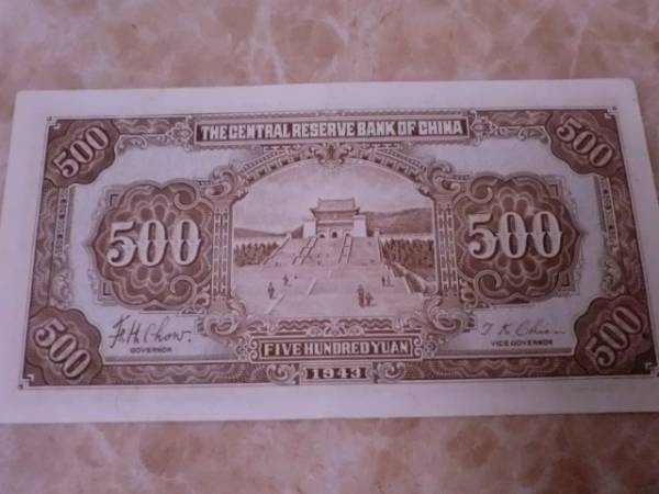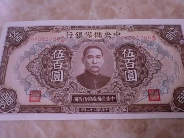 中央儲備銀行 伍百圓で1943年の極美品で大型紙幣です。