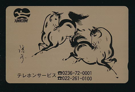 | ●848●かみのやま競馬(上山競馬)★馬2頭のイラスト/金地【テレカ50度】● | |