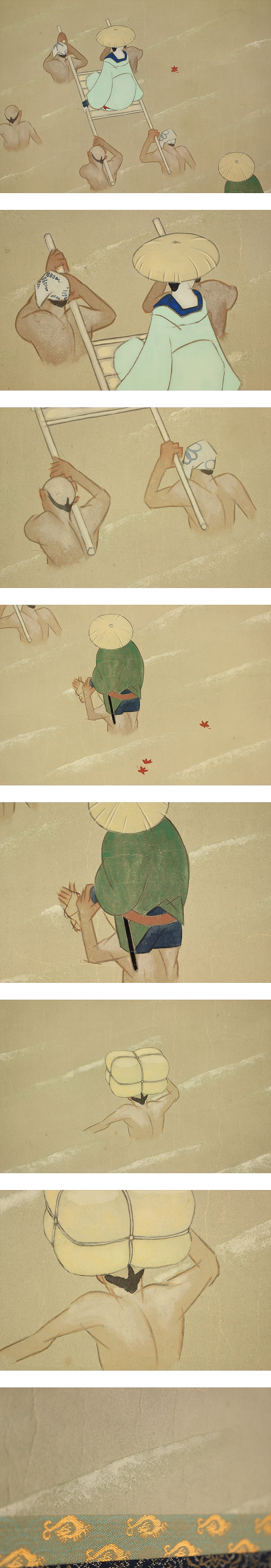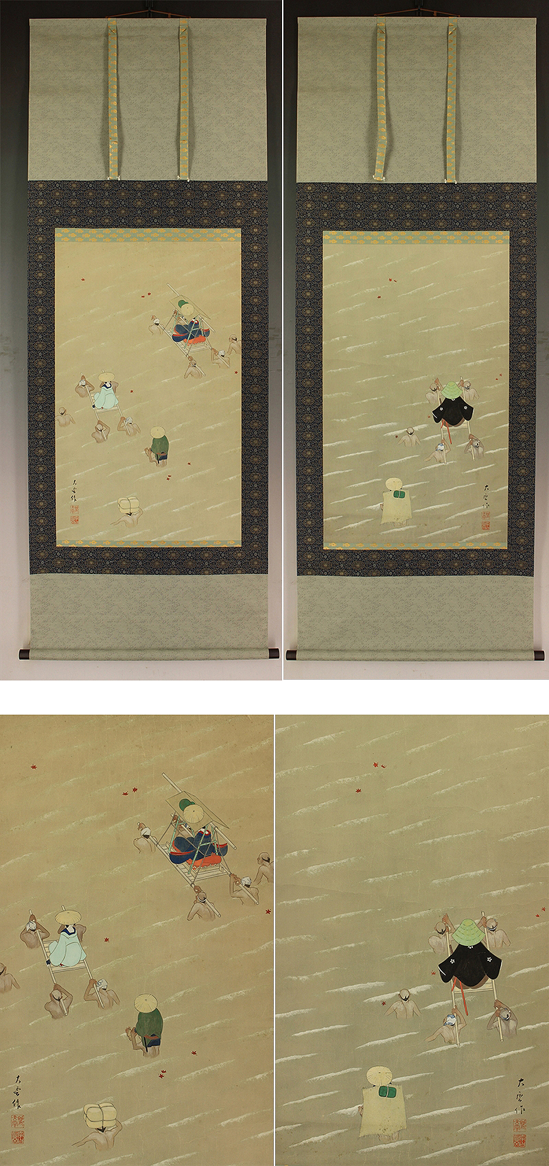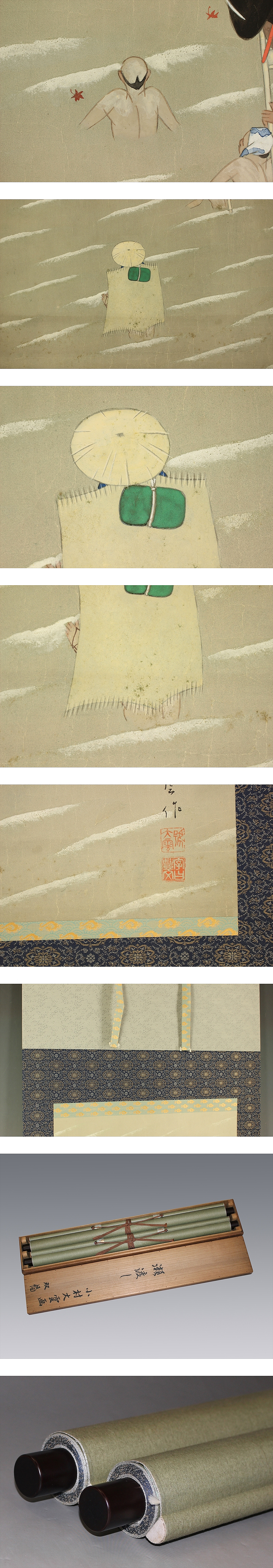 小村大雲 こむら たいうん 1883-1938 明治-昭和時代前期の日本画家。 明治16年11月9日生まれ。都路華香(つじ-かこう)、山元春挙に師事。大正元年文展で「釣日和」が3等賞、以後4年まで3等賞を連続受賞、さらに5年の「画舫」、翌年の「神風」は特選となった。13年より帝展委員。昭和13年2月20日死去。56歳。島根県出身。本名は権三郎。作品に「清風山月」など。 本紙は、染み、汚れ、折れ、しわ、縦じわがあります。 表装は、しわがあります。 【サイズ】 作品 横約51cm×縦約83cm 表装 横約66cm×縦約180cm |
