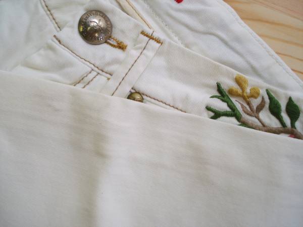 優しいオフホワイトにモカブラウンの太ステッチ・ウエスト部分には豪華な花刺繍・コンチョタイプのボタン&リベット。細部にこだわりを感じる存在感のあるパンツになります。