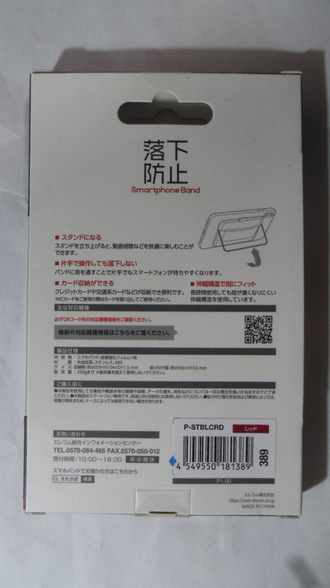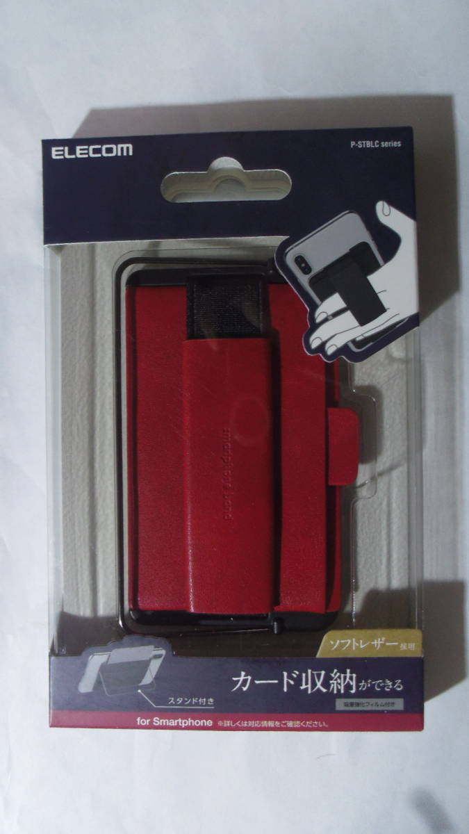 ELECOM レッド 赤 便利なカード収納付 背面貼り付ける事で指を通してスマートフォンを持つことができ、落下防ぐレザーバンド スマホリング