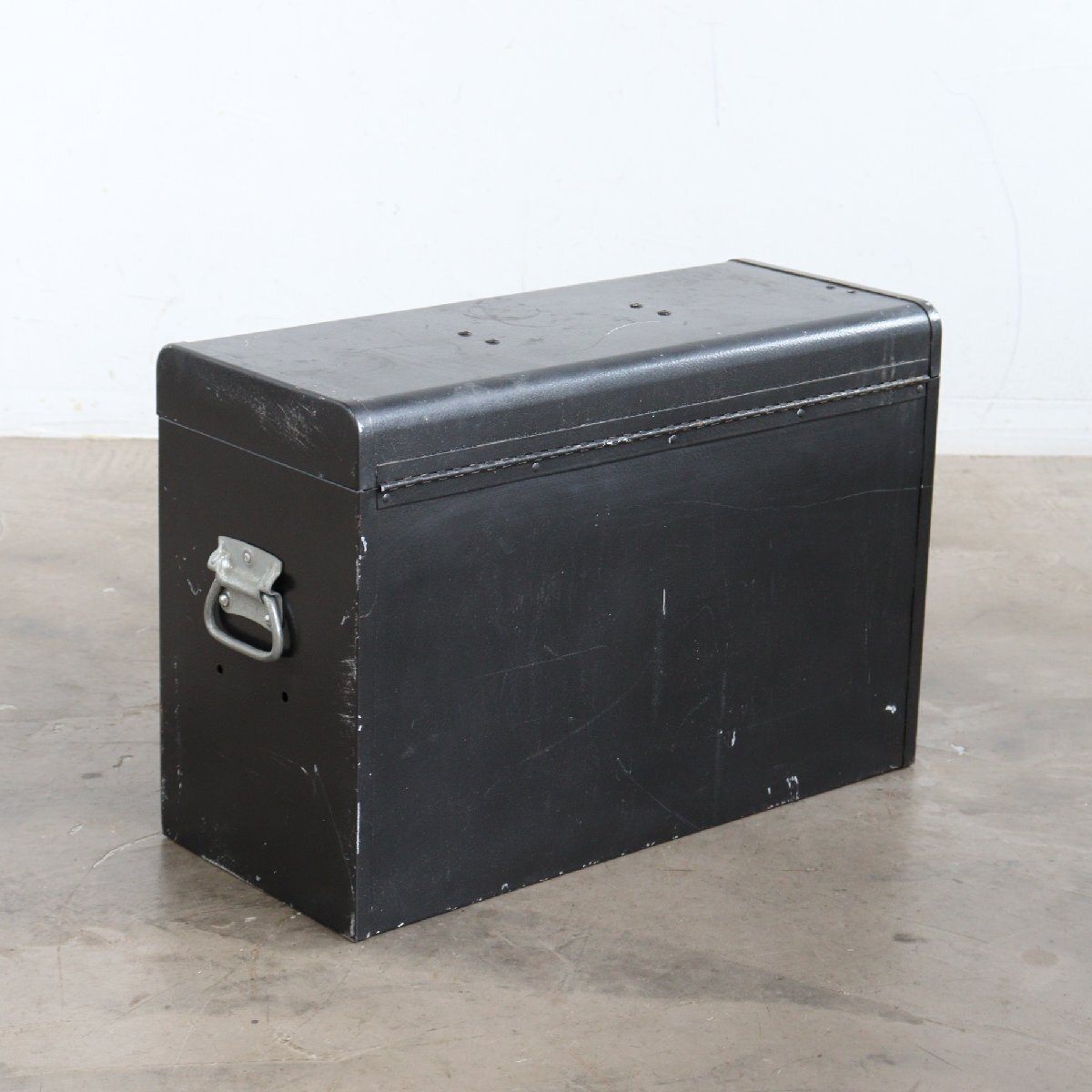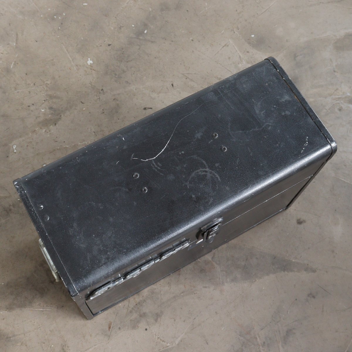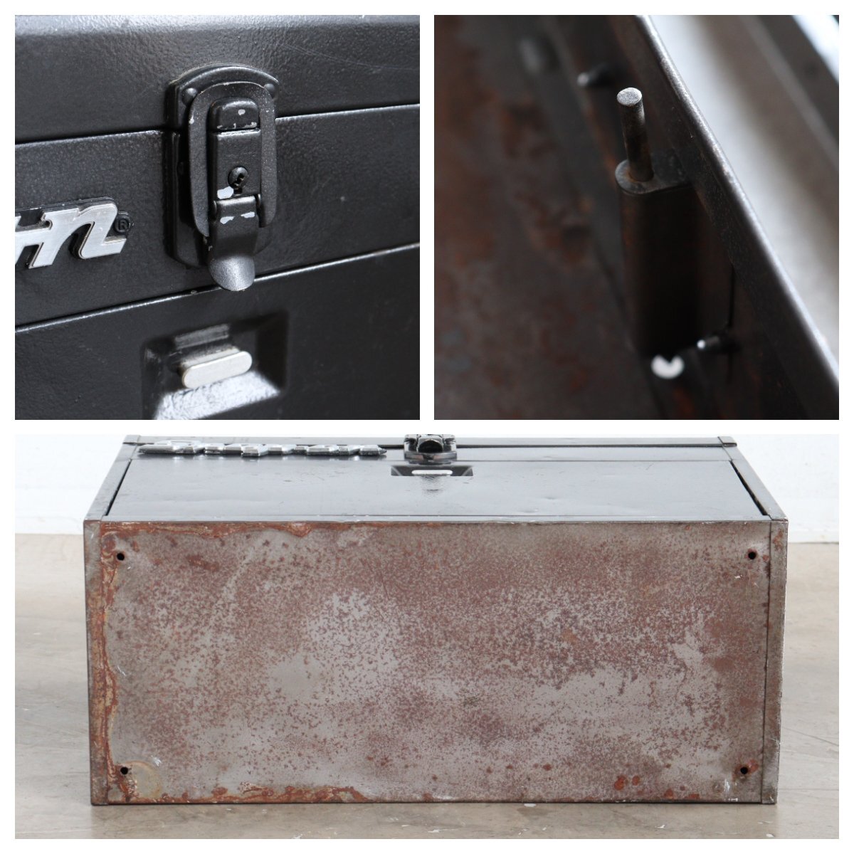 | コンディション condition | キズやサビ、色あせ、塗料のハガレ、取れない汚れなど経年による劣化があります。 ※ケースの金具が少し閉まりにくいです。(画像9枚目、左上)閉める際に少し金具を引っ張りながら閉めるようにしてください。 ※上蓋の内側の金具(画像9枚目、右上)が出にくいため、下の引き出しが動かないことがあります。 その際は手動で金具(画像9枚目、右上)を引っ張ってください。 ※鍵はありません。 詳細は画像をご覧ください。 |
