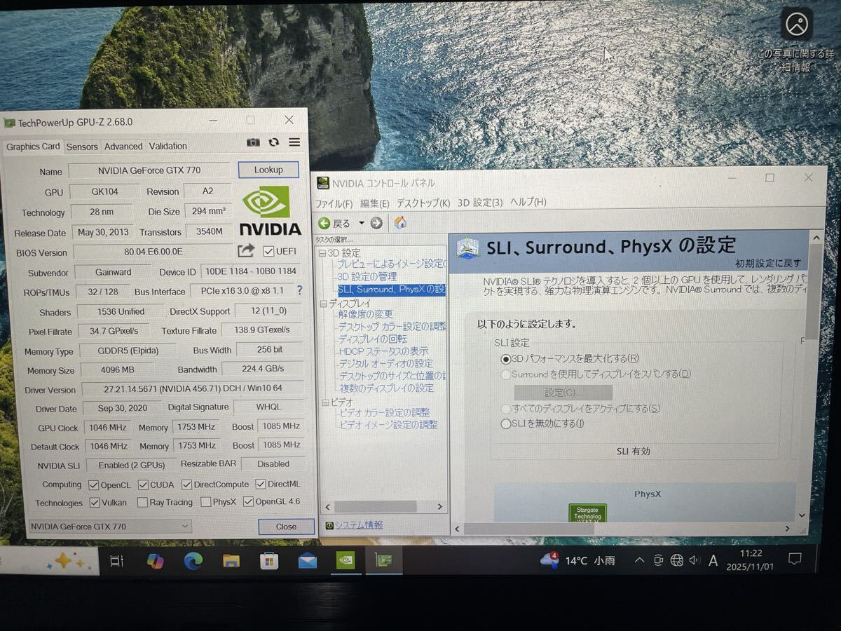 注意点① SLIに慣れている方なら問題ないと思いますけど2つのGPU各FANの回転順が負荷毎に変更調整しながら
