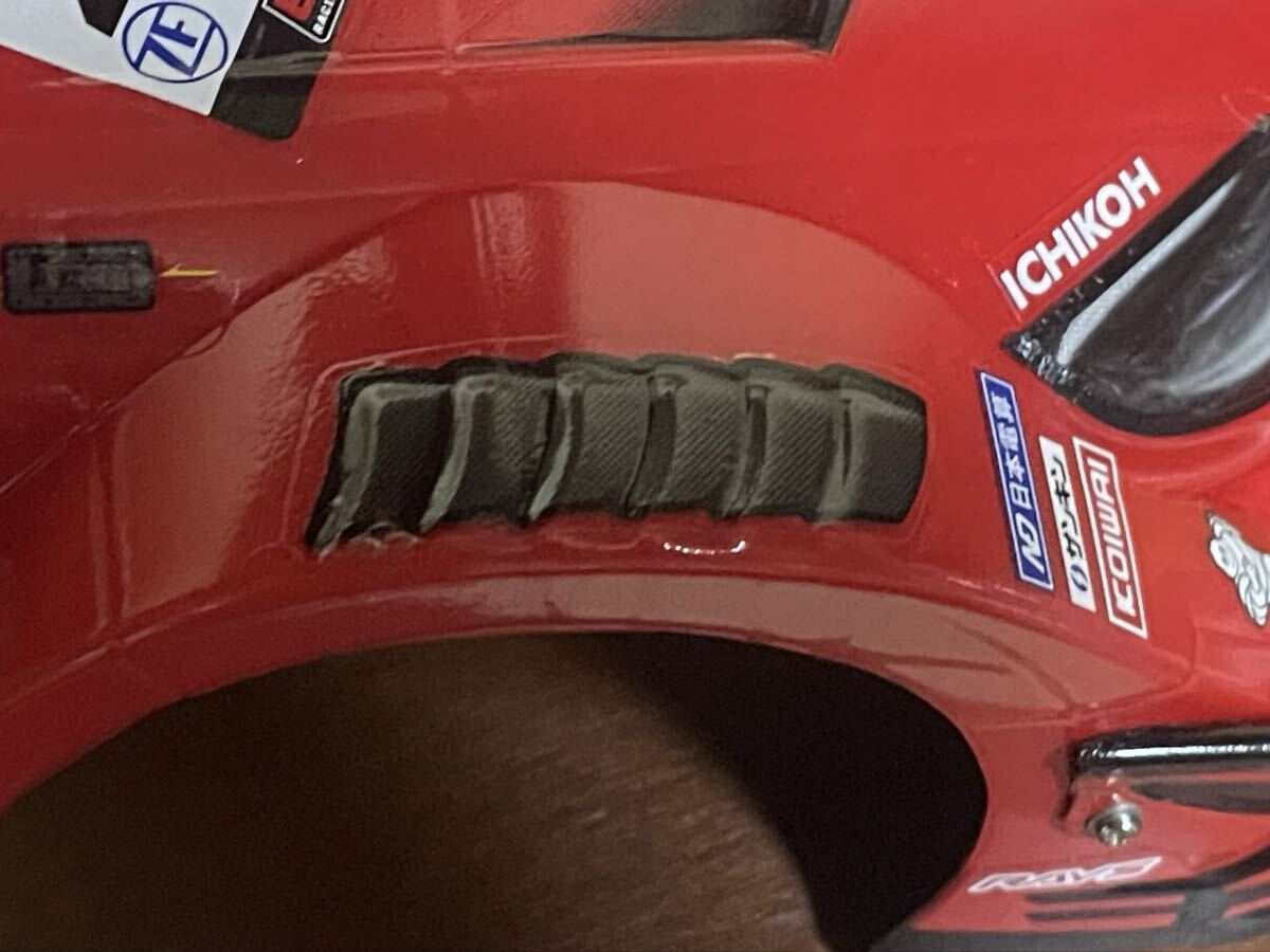ヒートガン片手に必死に水張りにて組み立てましたがデカールの多さに参りました。素人ゆえにエキスパートビルドには及ばないと思います。また、試走中にデカールを擦った部分があります。画像のシャーシ、タイヤ、ホイールは含まれません。ボディ本体と余ったデカールのみです。ただ最後にボディとデカール保護の為水性クリヤーを吹いてあります。宜しくご検討願います。