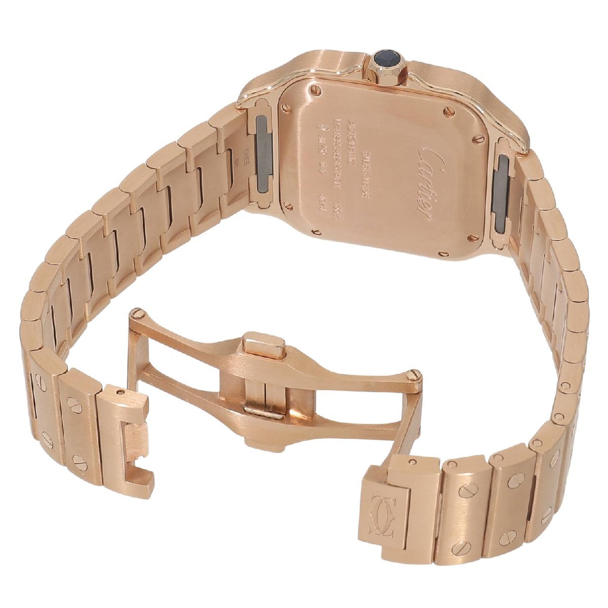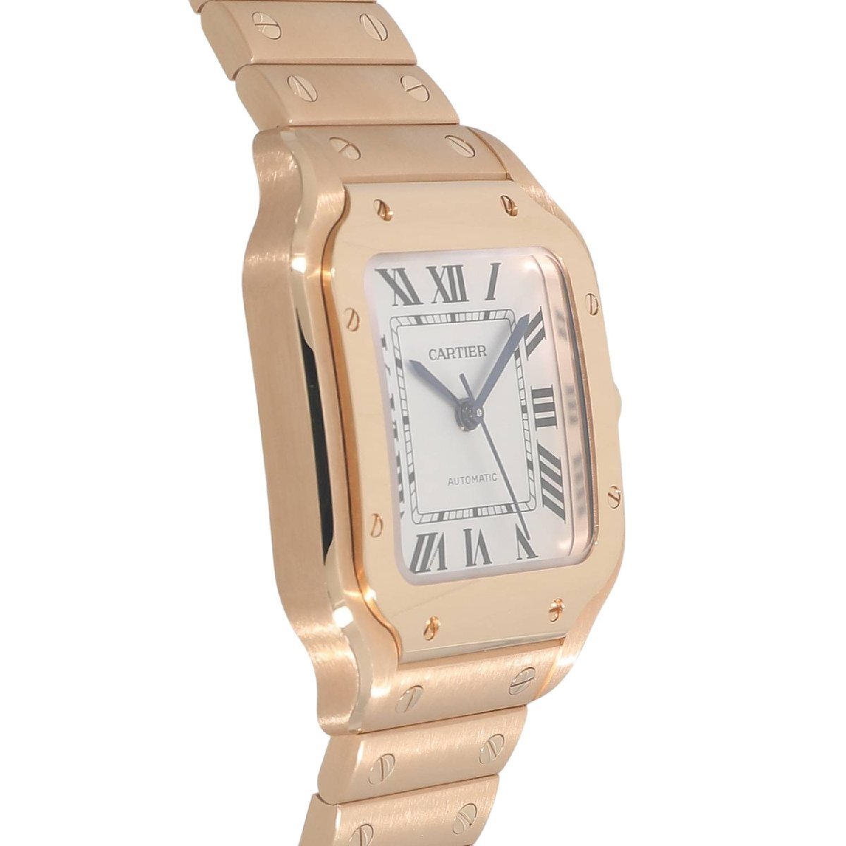| モデルについて | カルティエの創業者であるルイ・カルティエが、友人のブラジル人飛行士であるサントス・デュモンの依頼を受け、1904年に生み出したカルティエのアイコニックピースである”サントス・ウォッチ”。自社キャリバー1847MCを搭載し、2018年に新型のサントスが発表されます。最新のサントスの見た目はそのままに、ケースからブレスレットに至るまでピンクゴールドで統一されエレガント且つラグジュアリーな印象を放ちます。ブレスレットは簡単に着脱ができるクイックスイッチにより、シーンや気分によって付属のレザーストラップに交換が可能です。またブレスレットのサイズ調整もスマートリンク調整システムにより、容易にコマの着け外しが可能になりました。MMサイズは女性でもご使用いただけるサイズ感です。 |