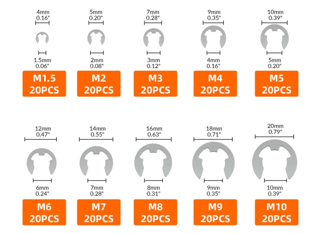 ステンレスEクリップ 1.5mm~10mm 10サイズ 200個セット