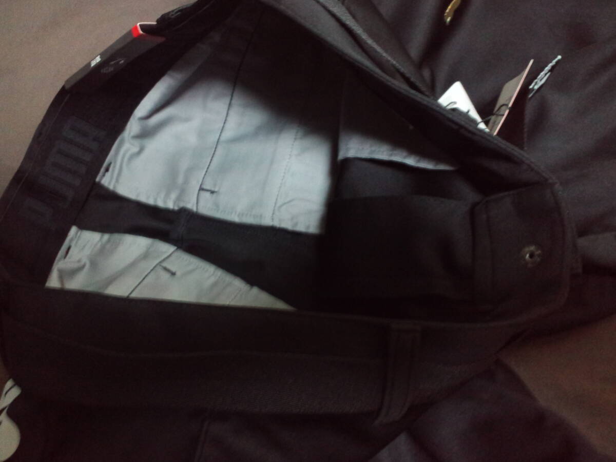 ジョガーシルエット 左ももにプーマキャットのメタルモチーフ サイドポケットジップ付き バックヨークにブランドビッグロゴプリント 片玉縁バックポケット ストレッチウエストバンド 取り外し可能なバックルベルト 裾上げ済み
