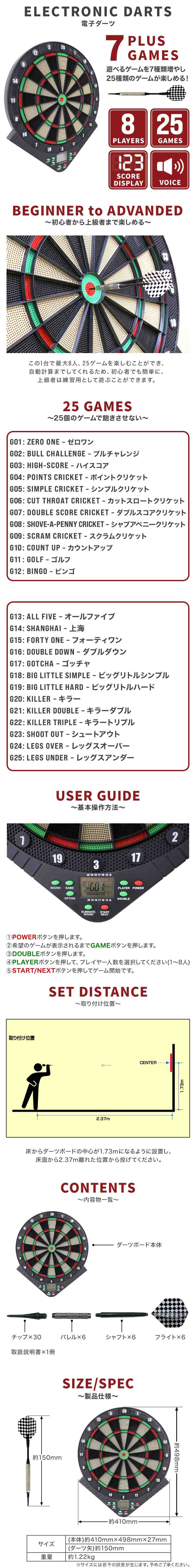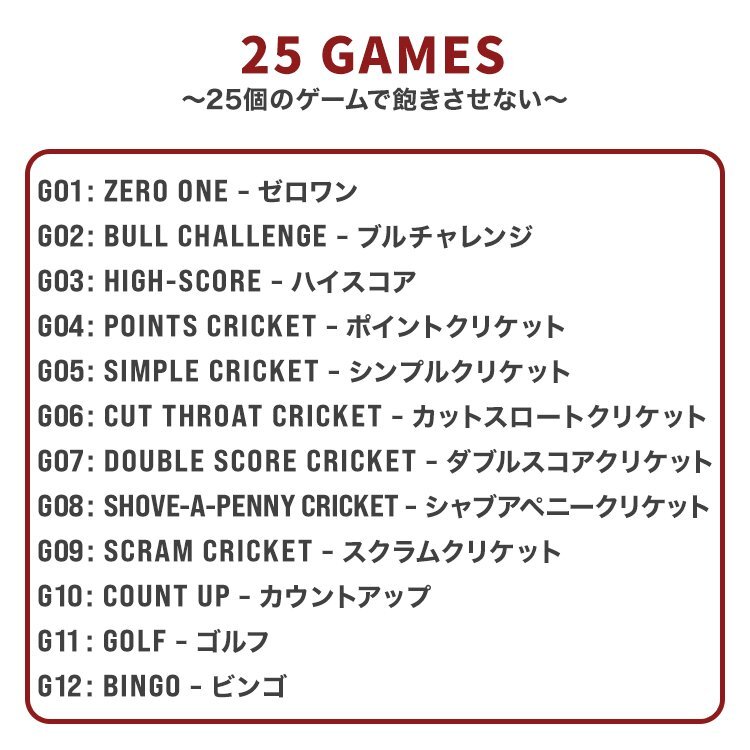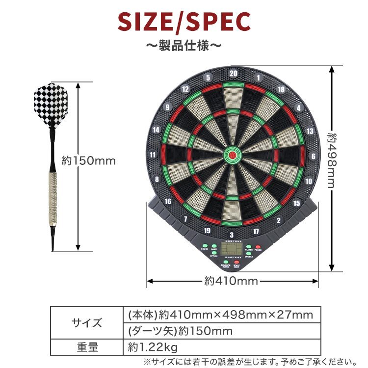 この1台で最大8人、25ゲームを楽しむ事ができます。 しかもダーツを始めるのに必要なパーツはすべて同梱され 自動計算までしてくれるので、自宅に届いたその日から遊ぶことができます!! ※単3電池が3つ必要です。ご了承ください。 ●商品仕様 サイズ: 本体)約410mm×498mm×27mm (ダーツ矢)約150mm 重量: 1.22kg ●商品内容 ・フライト×6 ・シャフト×6 ・バレル×6 ・チップ×30 ・取扱説明書(英語) ※ダーツ矢が6本分とチップ部分は破損が多いためスペアが入っております。 |