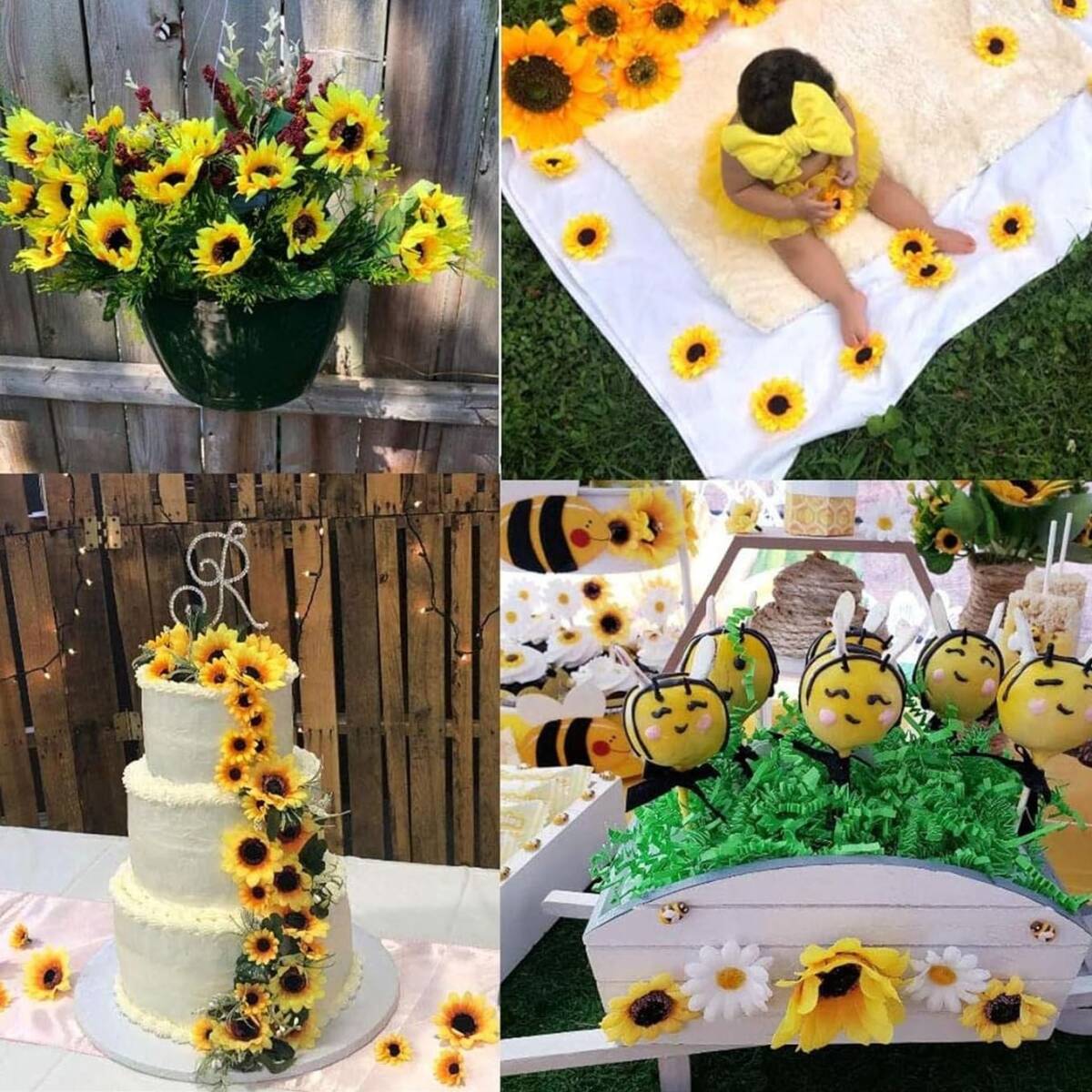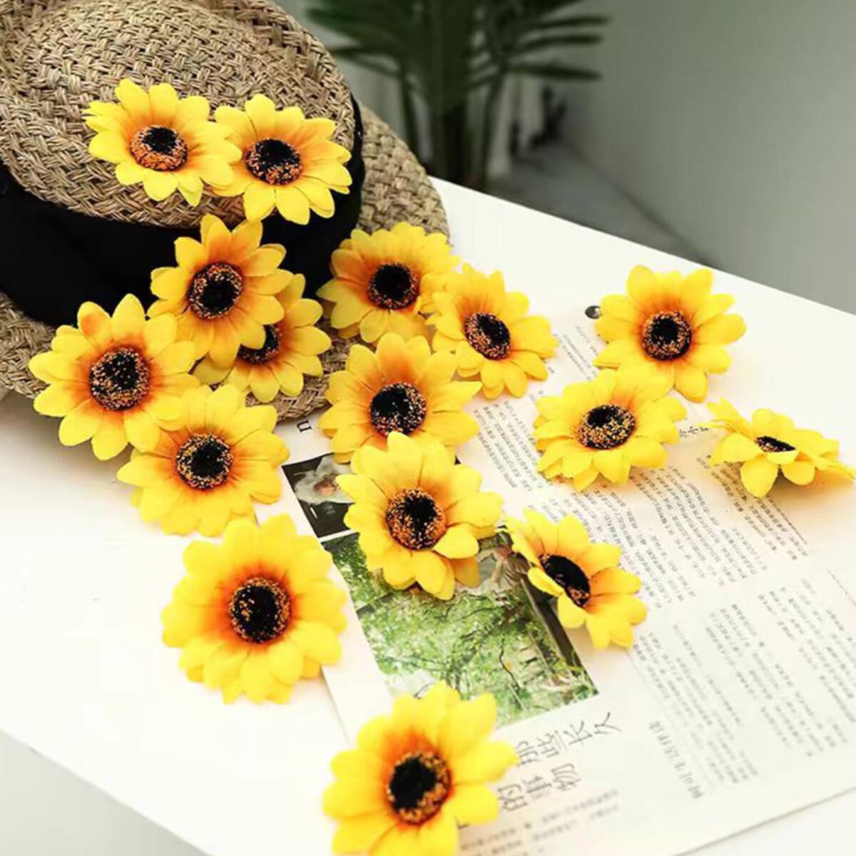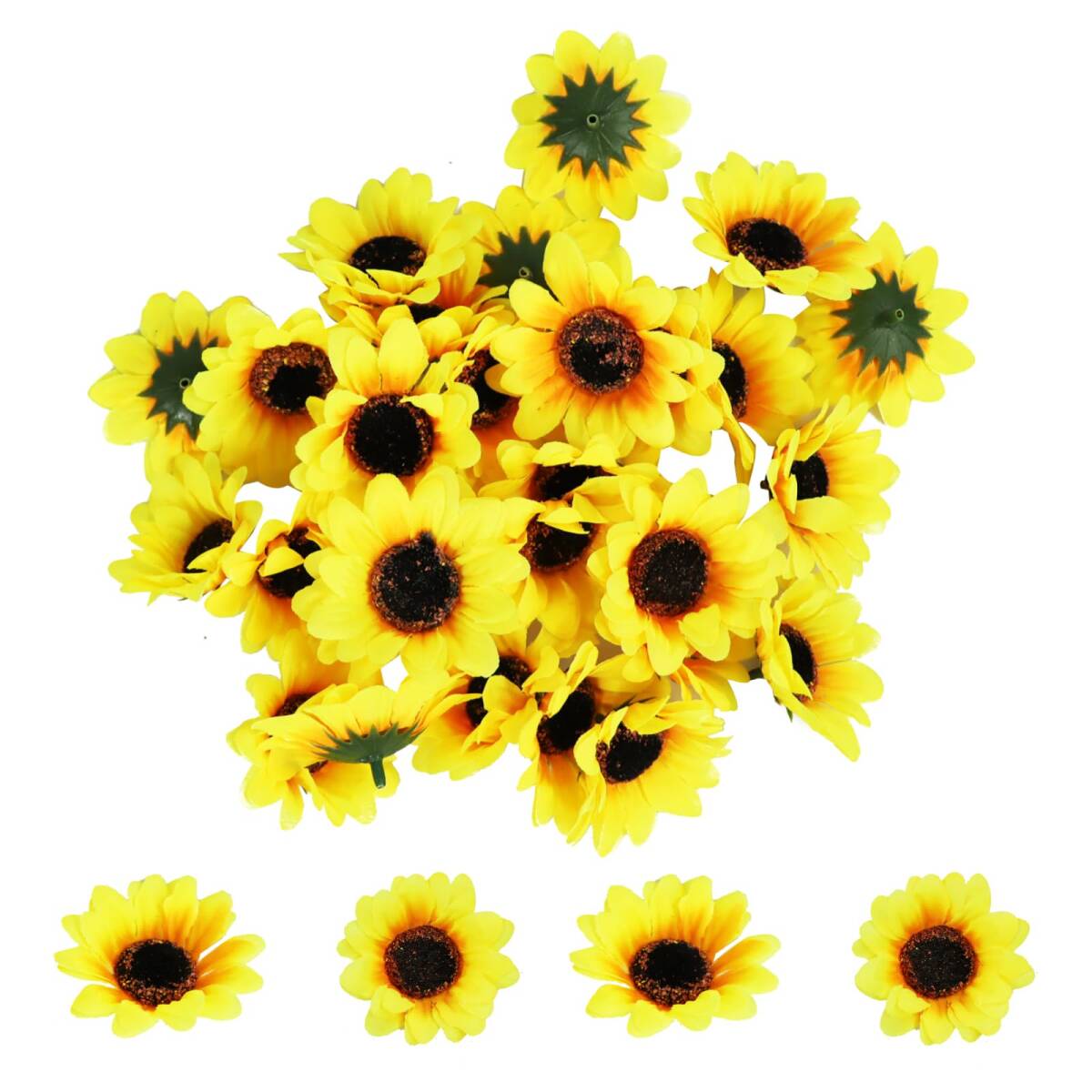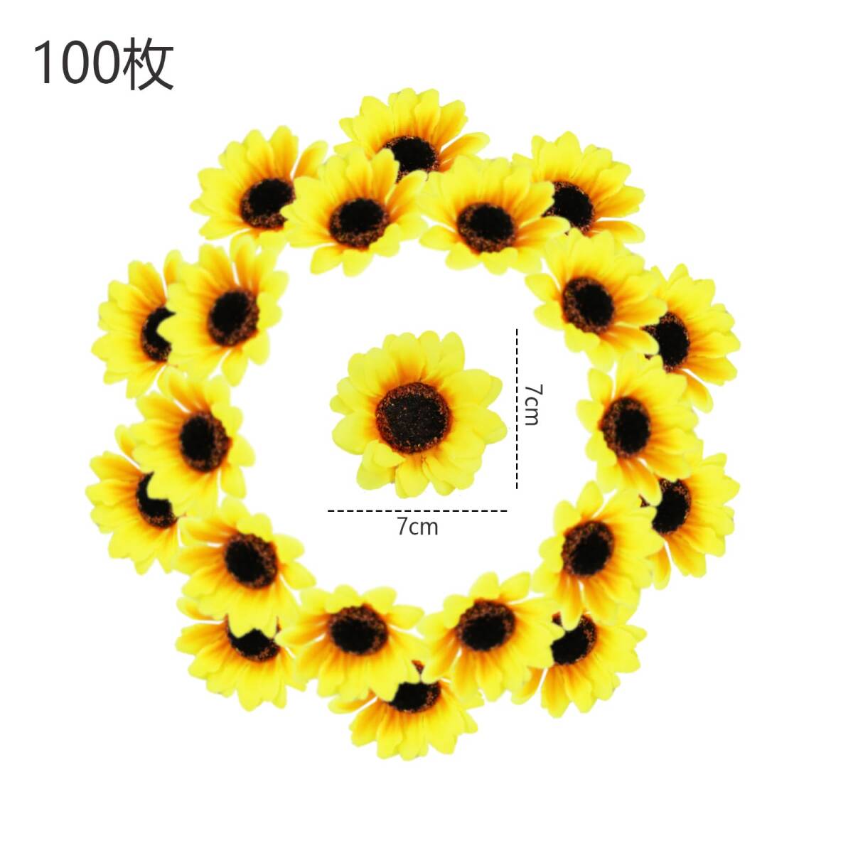 【商品仕様】:セット内容:ミニひまわり造花100個、直径:7cm、素材:シルク+プラスチック、色:イエロー
