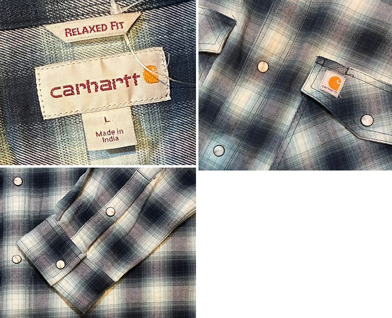 ビンテージ Carhartt カーハート 紺×白 シャドーチェック スナップボタン ネルシャツ L EJ2354-18-60-EJ28 検 90's USA製 オンブレ
