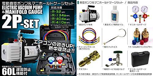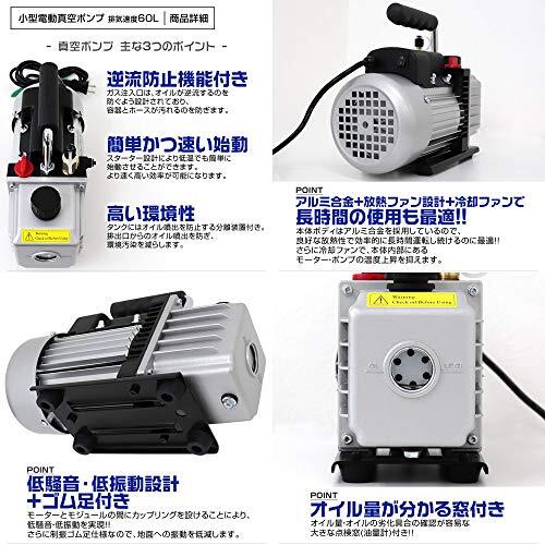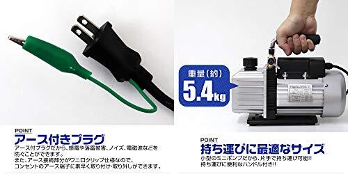【商品仕様】◆エアコンガスチャージ→対応冷媒:R134a、R410a、R404a、R32 ◆電動真空ポンプ→ローター方式:シングルステージ式 / 到達真空度:75ミクロン(10pa) / 排気速度:60l/min(50Hz)、72 l/min(60Hz) / 電源:AC100V(AC110V) 50Hz/60Hz / 消費電力:180W / 回転数:1440rpm(50Hz)、1720rpm(60Hz) / 吸気口径:1/4"フレア(UNF7/16-20) / サイズ(約):285×120×220mm / 重量(約):5.4kg / 逆流防止:あり / オイル封入量:250ml