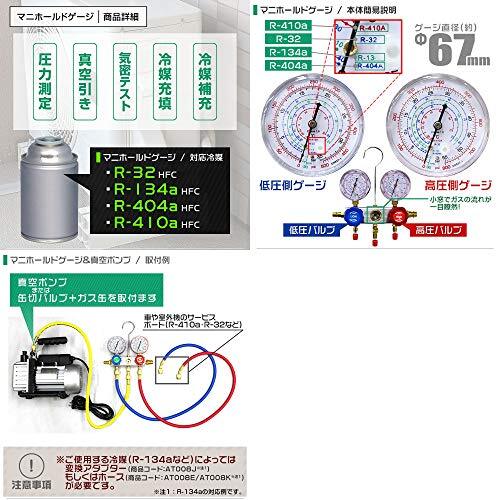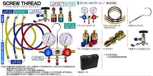 【商品内容(エアコンガスチャージ)】2バルブゲージ付マニホールド(取付用フック付)×1 / チャージングホース青赤黄(約900mm)×3 / R134a用高圧用クイックカプラー×1 / R134a用低圧用クイックカプラー×1 / R410aアダプター×1 / 専用缶切りバルブ付き専用ケース付き / 日本語取扱説明書