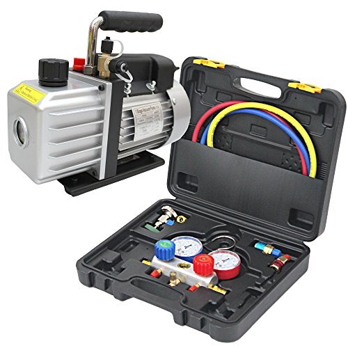 エアコンガスチャージキット マニホールドゲージです。電動真空ポンプ付きです!電動真空ポンプはオイル逆流防止機能がついているのであらゆる冷媒に対応しており、幅広い用途に使えます。低圧、高圧側圧力をメーターで表示し、コンプレッサーの動作や圧力異常等が目視で把握できます。真空ポンプを接続しての、真空引きにも対応可能です。窓付きで、ガスの流れが一目瞭然!窓付エアコンガスチャージキット マニホールドゲージです。チャージングホース、フック付属です。さらにおまけで缶切りバルブと便利なR134aクイックカプラー&R410aアダプター付き!!