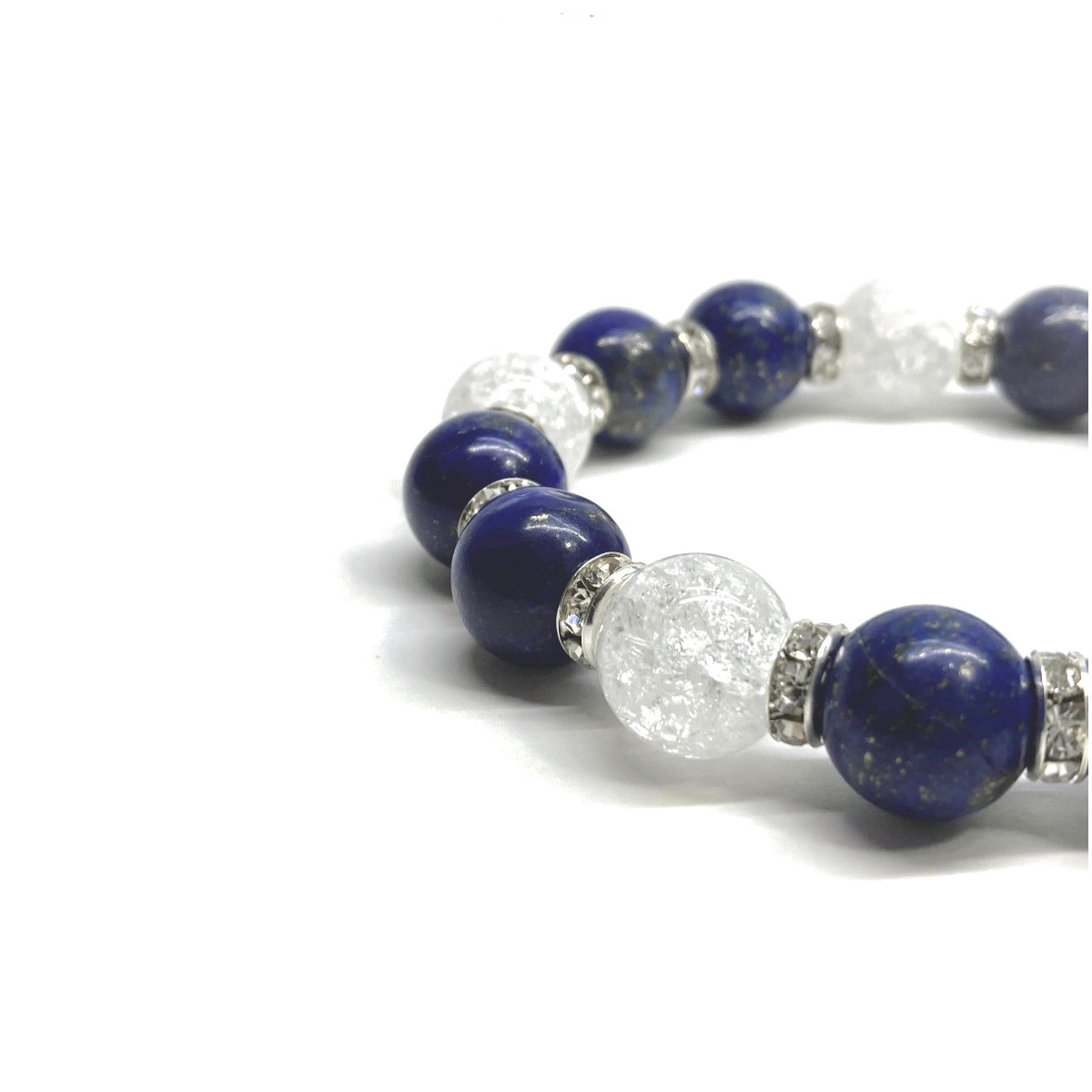こちらは、ラピスラズリとクラック水晶を組み合わせたパワーストーンブレスレットです。間にはロンデルを挟み高級感あるデザインに仕上げております。程よくインパクトがある12mm玉を使用して内周約18cmです。(サイズ変更の場合は取引ナビにてご連絡をお願いします。) 数に限りがございますので気になる方はお早めにどうぞ。