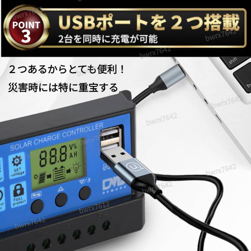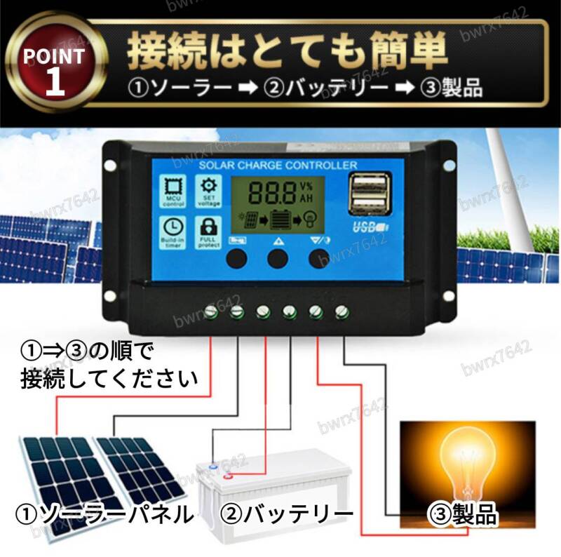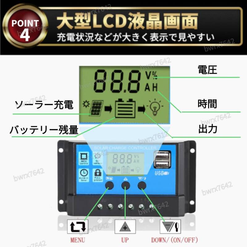 ソーラー チャージ コントローラー 30A チャージャー 12V 24V 充電 バッテリー LCD 液晶 自動調整機能 USB 太陽光 充電制御 安全 キャンプ