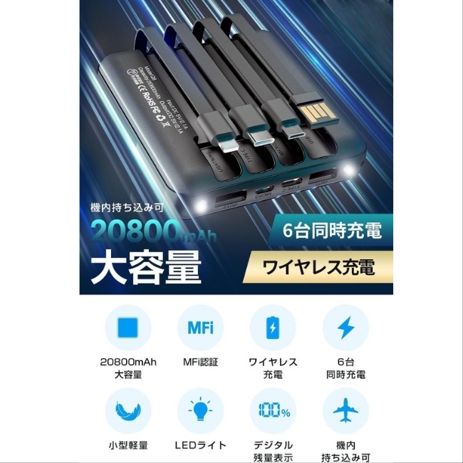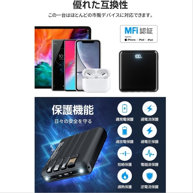 ご覧いただきありがとうございます。 商品名:ソーラーモバイルバッテリー 【この商品が品質で選ばれる理由】 突然の雨でも安心して使える防水対応で、お手入れも簡単な耐久性に優れたモバイルバッテリーです。 ■こんな悩みありませんか? ・スマホの充電がすぐになくなって困る ・災害時や緊急時に連絡手段がなくて不安 ・旅行や出張先で充電器の持ち運びが面倒 ★こんな時におすすめ! ・外出先での急なバッテリー切れに備えたい時 ・停電や災害時に備えておきたい時 ・アウトドアや旅行で安心して充電したい時 ------------------------------------- 【素材と耐久性】 ・防水対応: バッグの素材は防水に対応しており、防水ジッパー仕様なので、突然の雨でも安心して使用できます。 ・お手入れ簡単: コーティングが施されているため泥が染み込まず、拭けば綺麗になります。 ・収納物保護: バッグやマジックテープの素材が柔らかいため、収納したアイテムをキズつけにくいです。 ・高い耐久性: 生地はしっかりしていて耐久性もあるので、長くご愛用いただけます。 【機能性と利便性】 ・6台同時充電: USB-Aポート×2、3規格のケーブル内蔵、ワイヤレス充電で6台同時に充電可能です。 ・ケーブル内蔵: microUSB、USB Type-Cなど3規格出力ケーブルが内蔵され、専用ケーブル不要です。 ・本体充電: モバイルバッテリー本体に充電ケーブルが内蔵されているため、コンセントがあれば即時充電できます。 ・3種類の入力: 充電ケーブル内蔵、蓄電用microポート、蓄電用Type-Cポートの3つの入力選択肢があります。 【充電性能と表示】 ・急速充電: デバイスを自動で判別し、最適な出力で急速充電を行います。 ・最大2.1A: 出入力とも最大2.1Aの急速充電が可能で、素早く蓄電できます。 ・LCDディスプレイ: バッテリーの残量を正確に数字で表示します。 ・残量確認: 電源ボタンを短押しするだけで、充電残量を簡単に確認できます。 【非常時と携帯性】 ・LED懐中電灯: 非常時の電源や照明として利用でき、キャンプや災害時、散歩、夜道にも便利です。 ・小型デザイン: わずか198gの小型デザインで、持ち運びが非常に便利です。 ・大容量: スマートフォンを約5回、タブレットを約1.7回、各種スマホを約3.5回充電できます。 【安全性と対応機種】 ・多重防護メカニズム: 過電圧防護、過電流防護、バッテリー防護、短絡防護など、多重の安全保護機能を備えています。 ・MFi・PSE認証済: MFi認証とPSE認証を取得しており、安心して長期間使用できます。 ・幅広い対応機種: 各種スマートフォンに対応しています。 ご不明な点などございましたら お気軽に「質問する」からお問い合わせください。 |