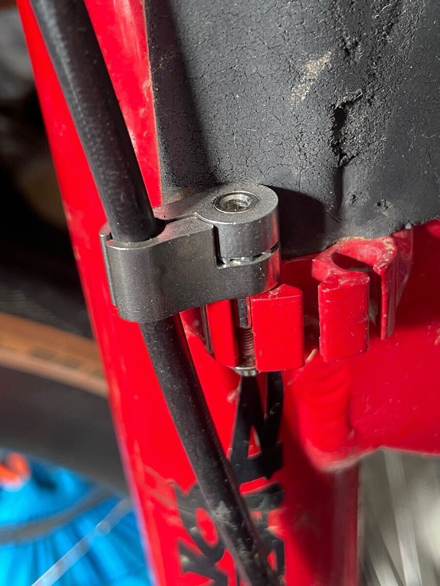 フレーム等のアウター受けを利用したマルチアウター固定小物。フレームを加工する事なくフルアウターで取り回し処理が可能になる小物。
