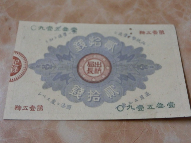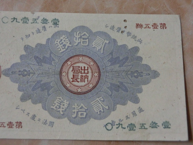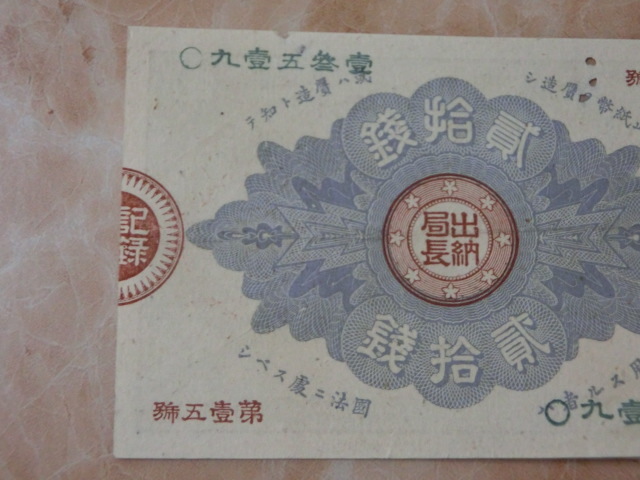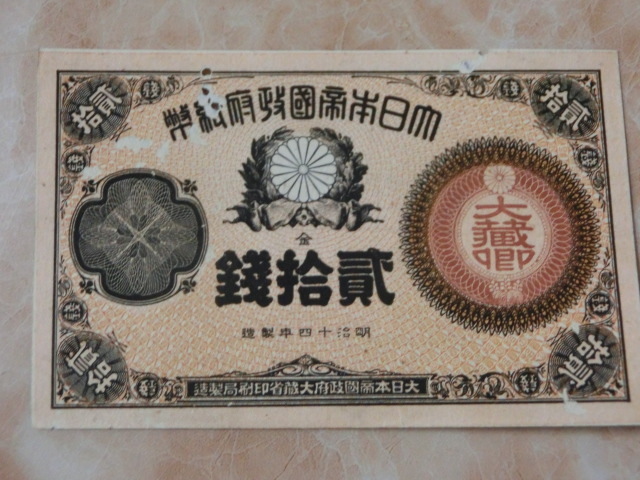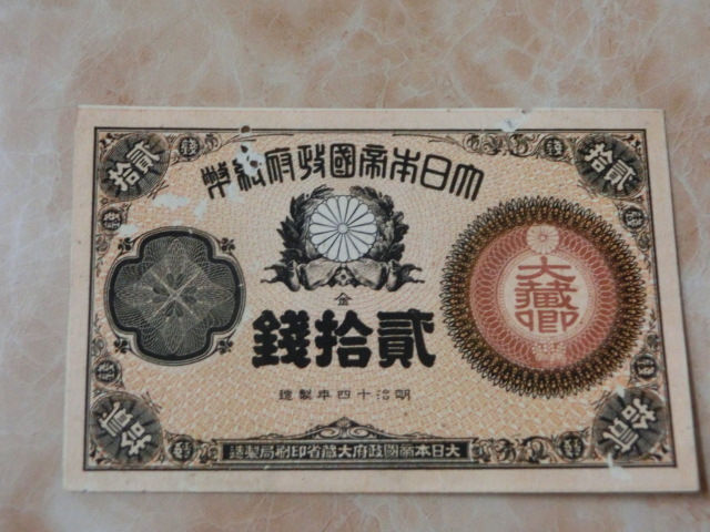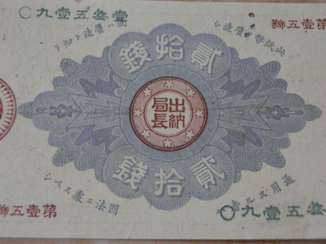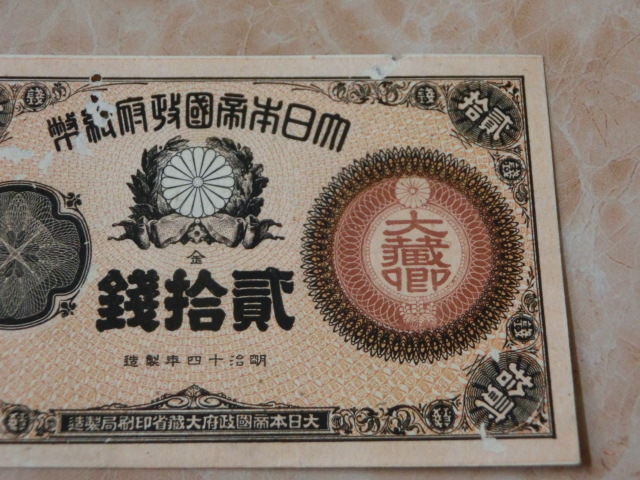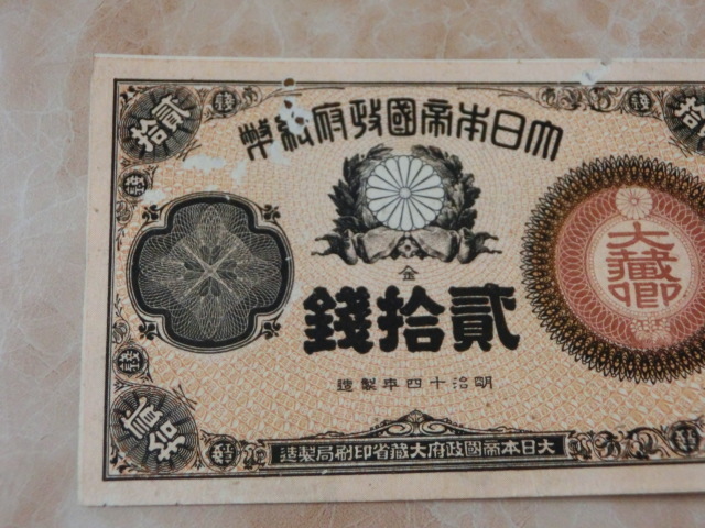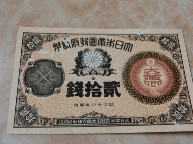 改造紙幣20銭 大蔵卿20銭の極美品で虫食い有りです。