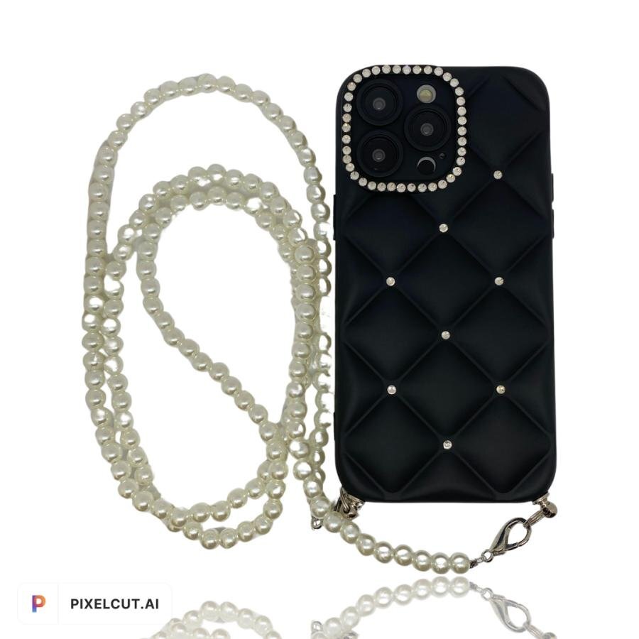◎ラインストーンが散りばめられたエレガント&キュートな大人女子に人気のスマホケース!パールの肩掛けストラップで一段と魅力アップ♪