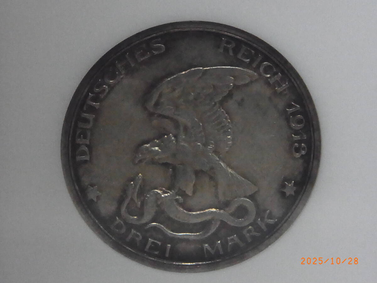 コ イ  ン    ドイツ 1913年 NGC AU58 ナポレオンの敗北記念3マルク銀貨です。