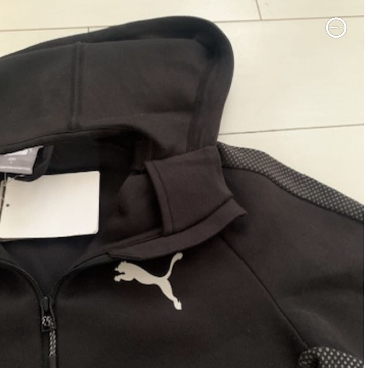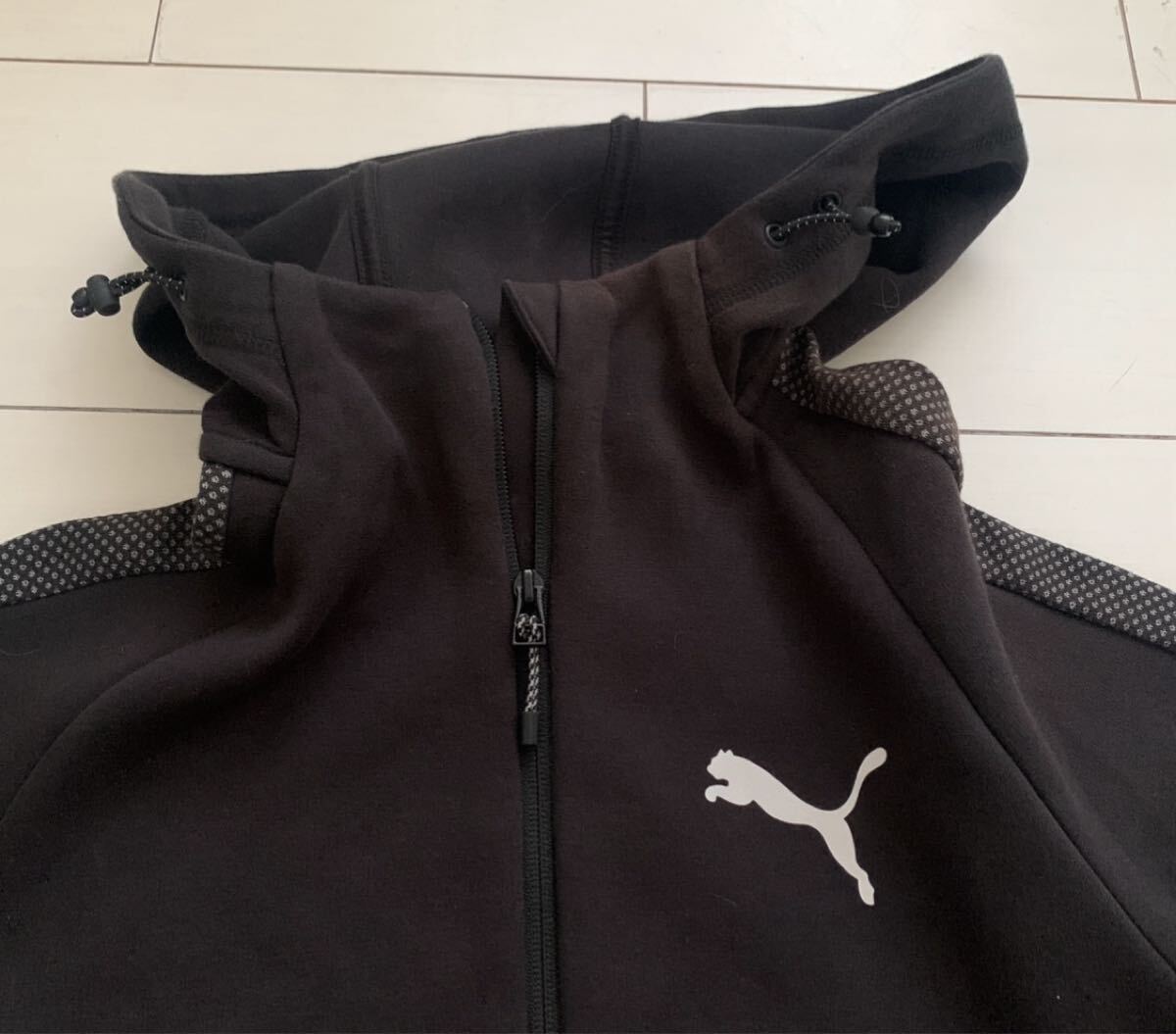 プーマ(プーマジャパン(株))、EVOSTRIPEコレクション、ジップアップのフーディージャケット。 ※左襟フード部分にヤケがございますので(写真4枚目〜8枚目参照)格安出品します。ご理解いただける方のご購入お待ちしております。 しっかりとした生地です。やわらかく伸縮性のあるコットン素材を使用し、快適でストレスフリーなフィット感を実現します。