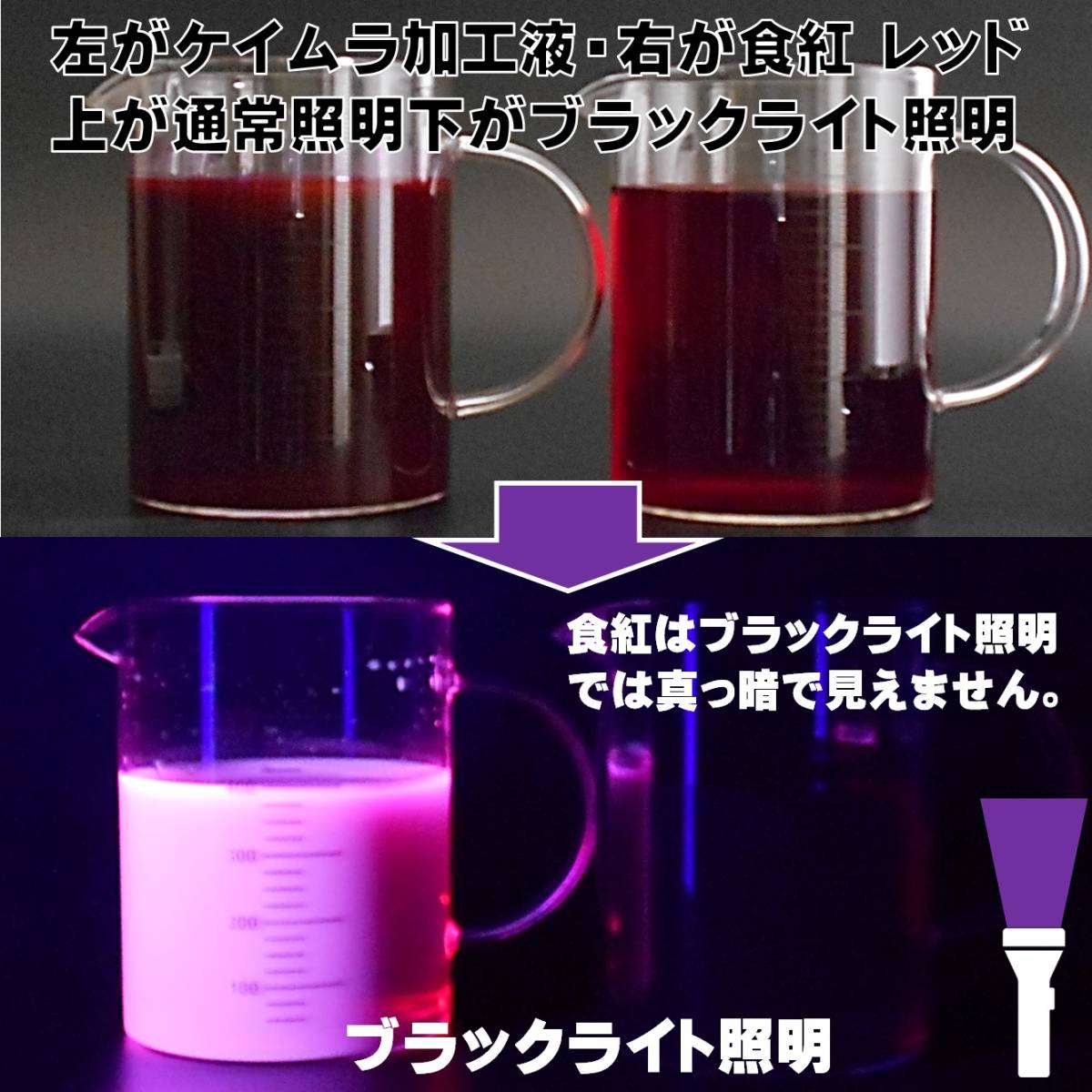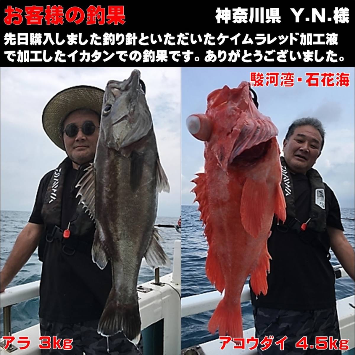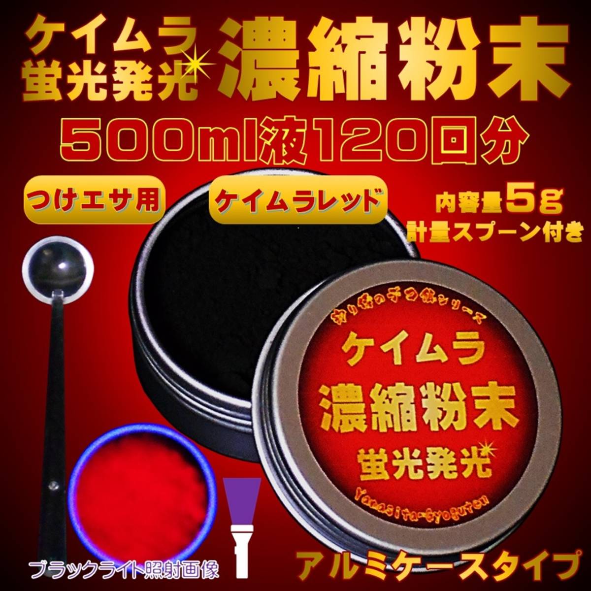 魚の視覚刺激効果つけエサ用 ケイムラ 紫外線 蛍光発光 濃縮粉末 パウダーを付属の計量スプーンで適量水に溶かしてつけエサに漬けるだけで紫外線に蛍光発光加工できます。※注 食紅とは全く違います。食紅は紫外線に発光しません。ブラックライト画像をご確認ください。犬や猫にも見えていますが、魚にも人間に見えない紫外線の不可視光線が見えています。また多くの魚たちは色を識別しています。ケイムラ 紫外線 蛍光発光 濃縮パウダーは、そんな魚に見えている紫外線に蛍光発光する濃縮粉末です。つりエサ 用 集魚剤 紫外線 ケイムラ 蛍光発光 濃縮パウダーを適量水に溶かしてつけエサに30分程度漬けるだけで 紫外線発光するエサになります。※エサの種類や量によって異なりますが長時間漬けることによりつりエサに良く染み込みます。食紅と違って非常に濃厚な粉末なのですこしずつ、付属の計量スプーンで色の濃さをお好みに調整してください。例えば釣具店で販売されている発泡の箱に入ったオキアミには、およそ80ml~100mlの水が入りますが、100mlの水に付属の計量スプーンなら5分の1~半分ほどで十分です。つけエサに使用する場合は、ご使用になる量にもよりますが、計量スプーン摺切り一杯で120回は繰り返し使うことがます。オキアミ イカ サバ サンマ イワシ ホタルイカ カツオ きびなご イソメ アサリのむき身などあらゆるつけエサにご使用になれます。※注意 濃縮パウダーは少量でもこぼしたり手で触ると色が広がってしまうので取り扱いには注意が必要です。セット内容山下漁具店 釣り侍のデコ餌シリーズつけエサ用 ケイムラ 紫外線 蛍光発光 濃縮粉末 ケイムラレッド 5gアルミケース計量スプーン