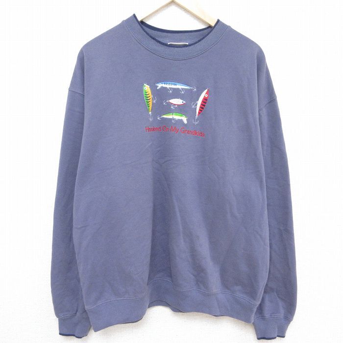 【商品名】 XL★古着 長袖 スウェット メンズ 00年代 00s ルアー 刺繍 クルーネック 薄紺