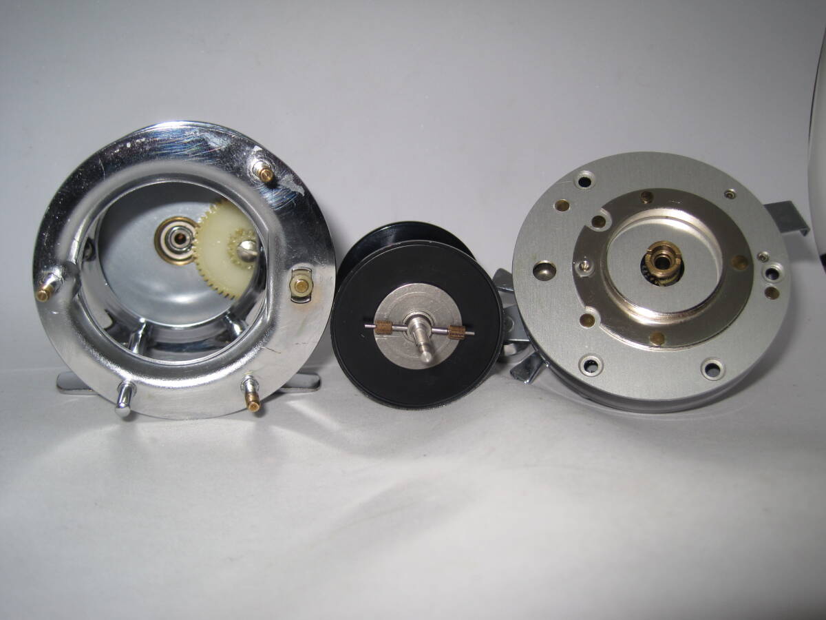 - シルバーのアルマイト塗装されたサイドプレート、ハンドル、スプールはアルミ製です。めっきされたフレーム、ドラグ等は真鍮製です。