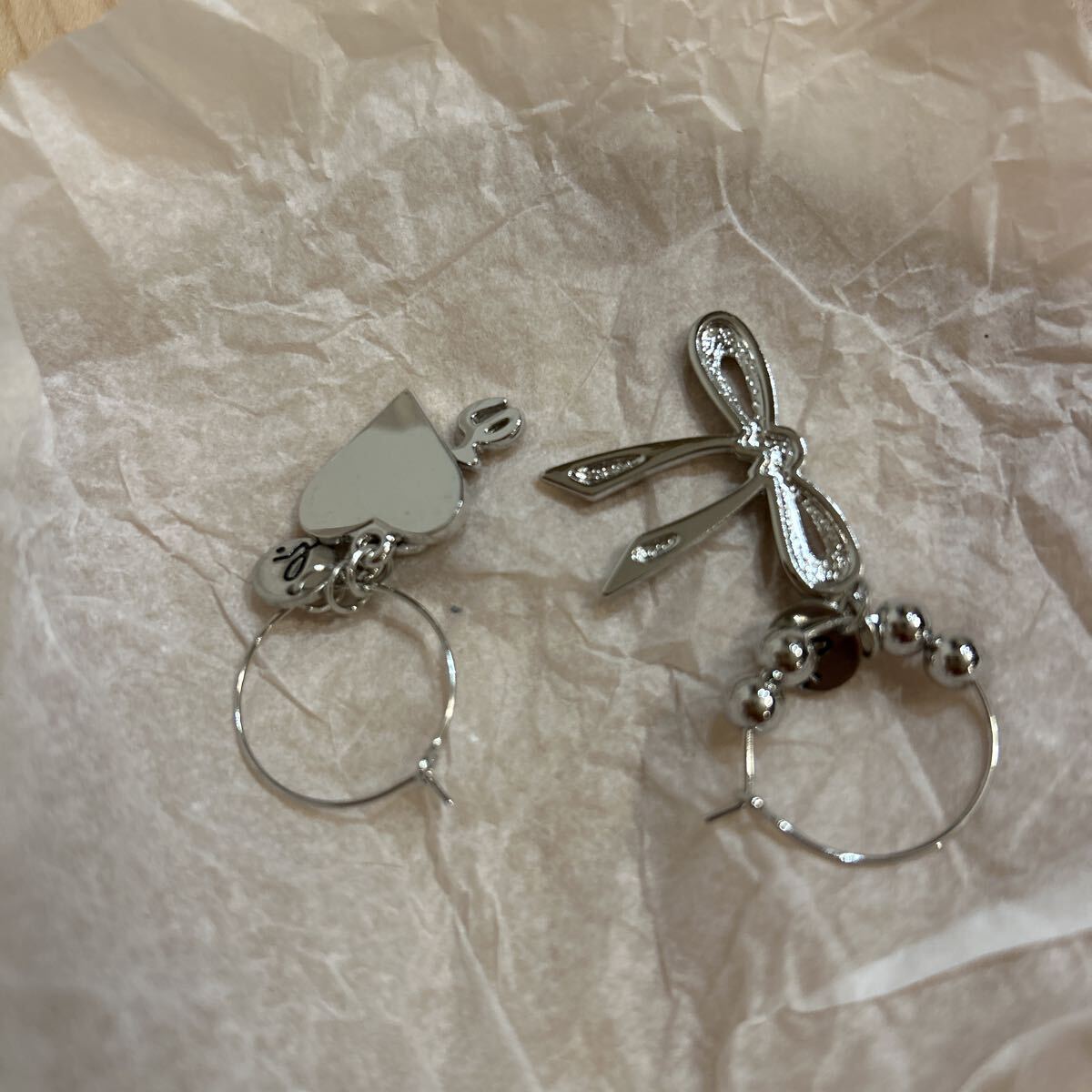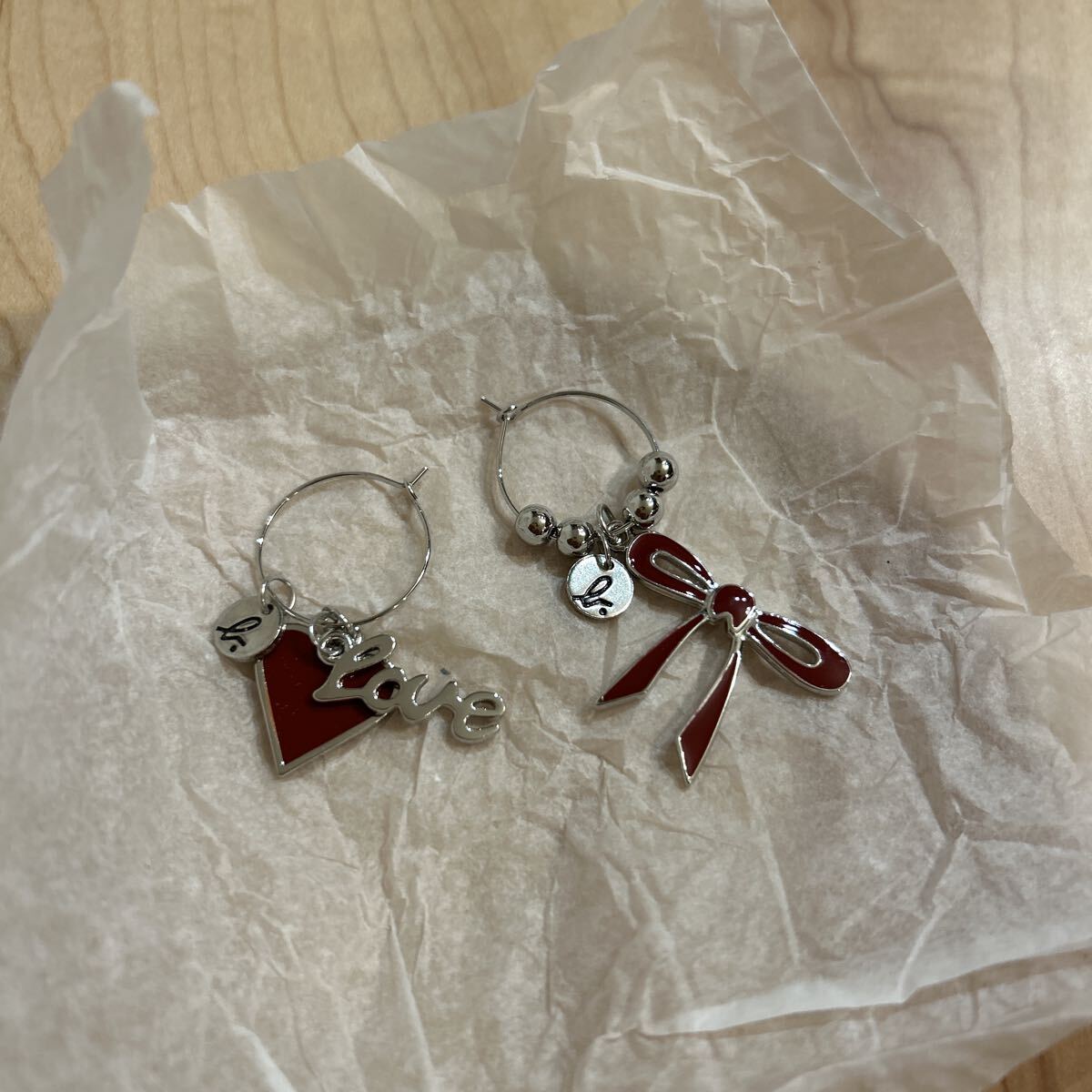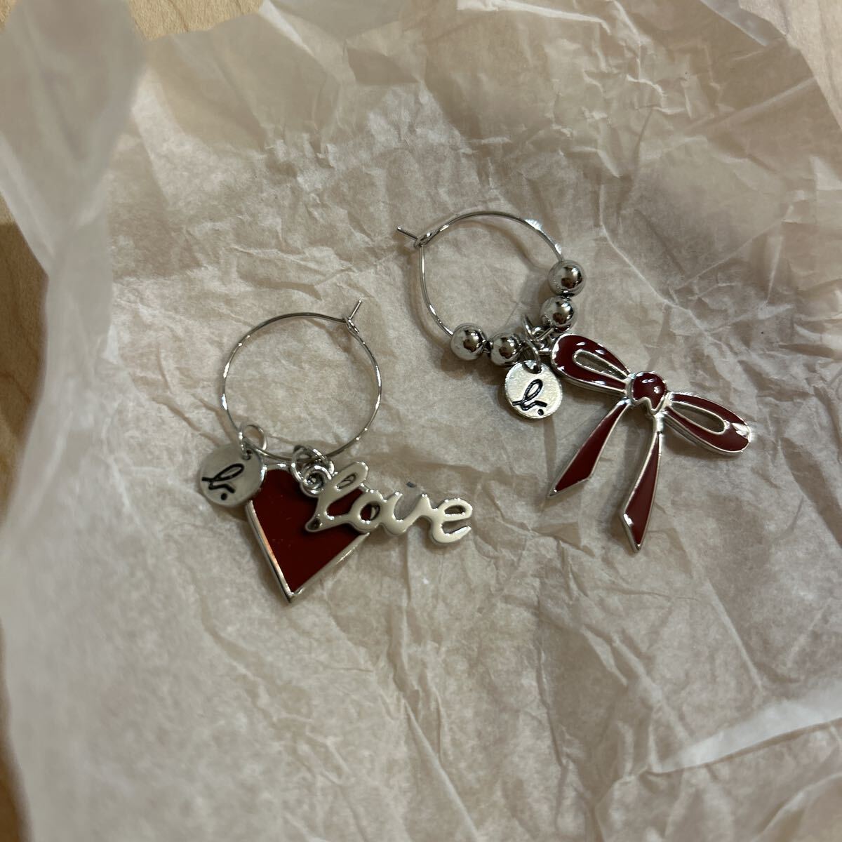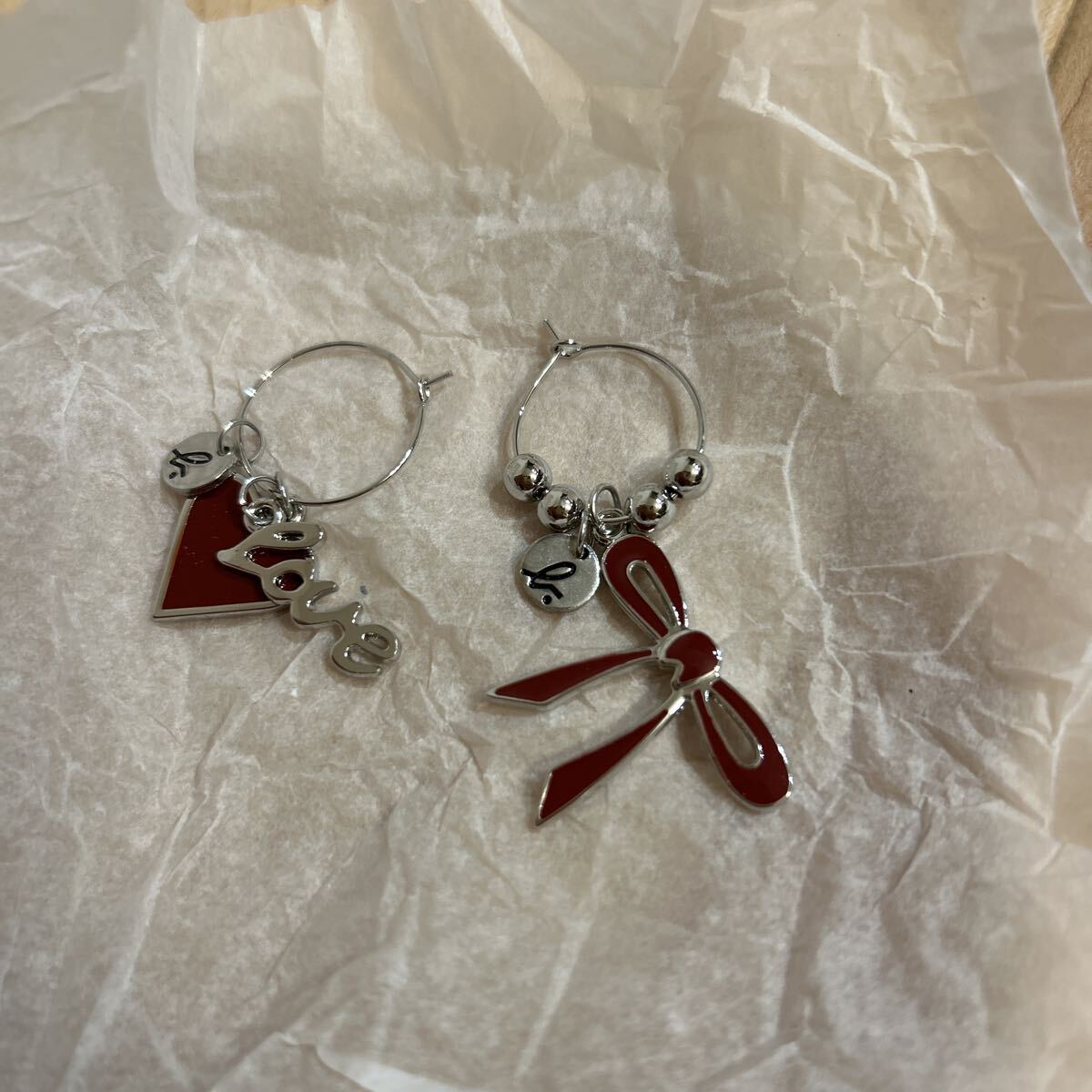 アニエス・ベー アクセサリー リングピアス ハートにリボンモチーフ赤色 ピアス フープピアス
