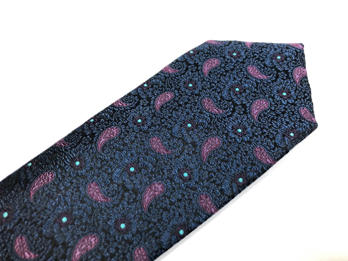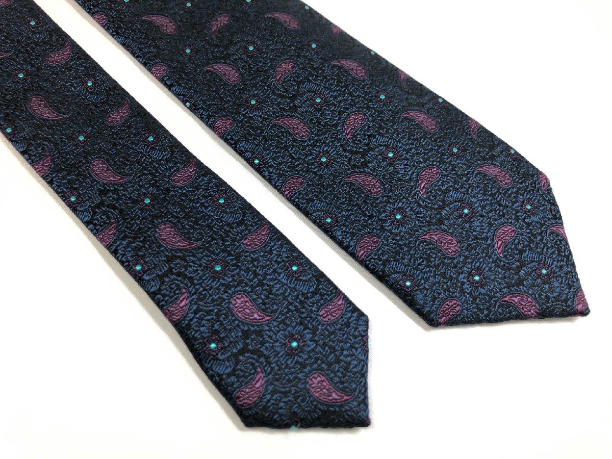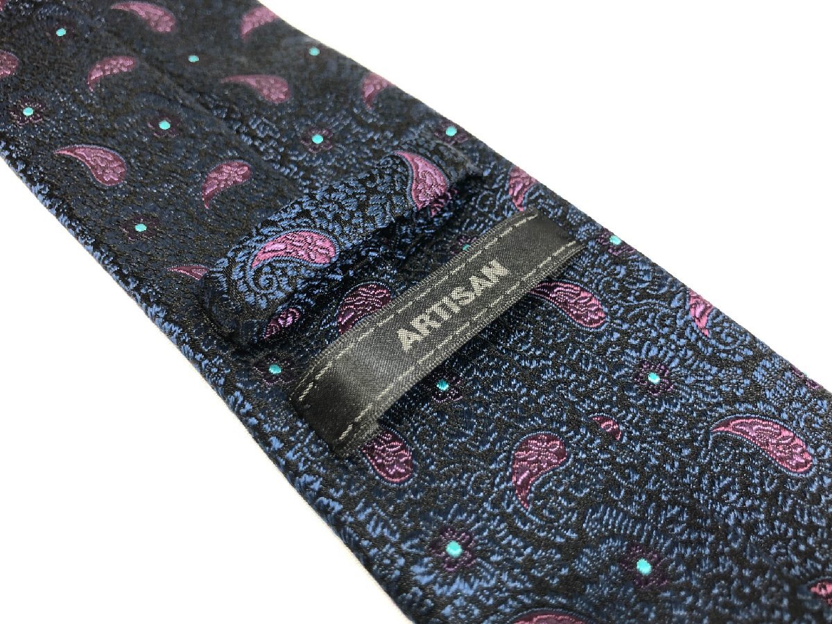 超美品【アルチザン ARTISAN】お洒落なペイズリー刺繍柄♪ シルク ネクタイ (メンズ) 濃いめのネイビー×パープル系 ◇17MM8704◇