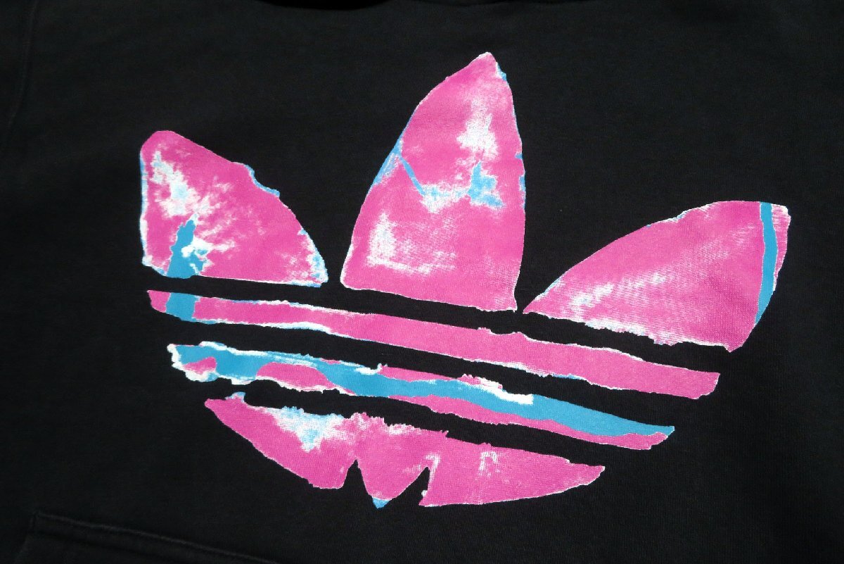 胸元のピンク×水色のトレフォイルロゴや右袖の水色×白のブランドロゴがポイントになっています。