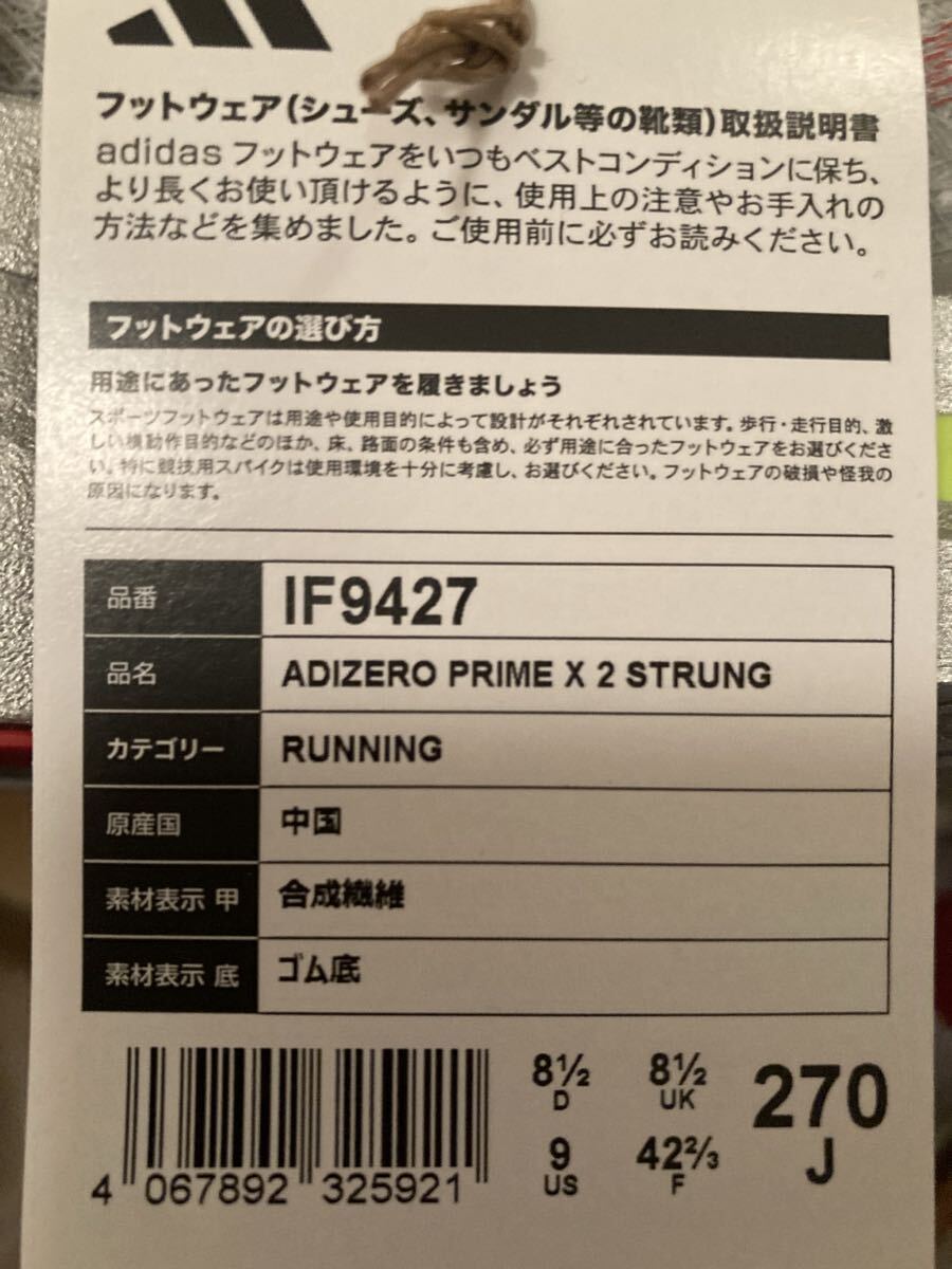 | 新品、箱なし。品番IF9427 未知の速さを体感したいランナーへ。世界標準のレース規定に縛られず、イノベーションを結集しパフォーマンス重視の先進テクノロジーを搭載したアディゼロ プライム X 2.0 STRUNG。アッパーのSTRUNGとは、アスリートのデータをそれぞれのニーズに合わせて微調整し、素材に反映する先進テキスタイル技術。さらに、このモデルには、高さ50 mmになる3層のLIGHTSTRIKE PROを採用。2層のフォームの間に全く新しいエネルギーコアを挟むことにより、軽量化を図りながら、前足部と中足部にバネのような反発をもたせ、アスリートが自己最速の瞬間を追い求めるのを後押し。Continentalコンパウンドを採用したアウトソールが、様々なコンディションの路面で優れ カラーや詳細が気になる方は品番よりご確認の上、入札してください。 新規の方は削除する事もありますので、あらかじめ質問欄よりご連絡ください。 発送まで1~3日かかる場合があります。 |