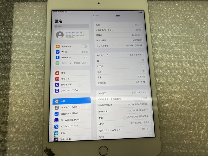 EQ654 SIMフリー iPad mini 第4世代 Wi-Fi+Cellular A1550 シルバー 128GB ジャンク ロックOFF