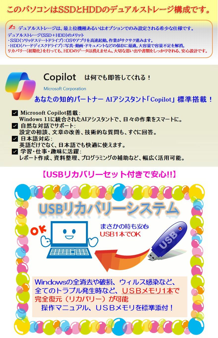■ 高性能:快適な動作と高速処理を実現するスペックを搭載。 CPU:第10世代 Intel Core i7-10510U(4コア8スレッド、最大4.9GHz) → 第7世代i7より約2倍の性能向上 → Windows 11 正式対応CPU搭載で、今後のWindowsアップデート(第8世代以降が必須条件)も安心。 ![]() メモリ:DDR4-2666 16GB(デュアルチャネル対応) → 高速データ転送で複数作業もスムーズ ストレージ:M.2 NVMe SSD 512GB(最大読取3000MB/s)+HDD 1TB → SSDは従来のSATA SSDの約6倍の速度で、アプリも瞬時に起動 → SSD+HDDの組み合わせで、速度と大容量を両立 ■ 映像&視覚性能:日常からビジネス・クリエイティブまで幅広く対応。 グラフィックス:Intel UHD グラフィックス for 10th Gen → 動画編集やゲームも快適 ディスプレイ:15.6型 フルHD 非光沢液晶(1920×1080) → 長時間作業でも目が疲れにくく、広視野角で鮮明な表示 ドライブ:DVDマルチ搭載 → 映像視聴・書き込みにも対応。マルチメディア用途に最適 ■ 拡張性&通信性能:周辺機器との接続や将来的な活用にも柔軟に対応。 WiFi6(ax) & Bluetooth 5.1 → 高速・安定通信でオンライン作業も快適 HDMI(4K対応)/USB3.1/SDカードスロット → 外部ディスプレイやストレージとの接続も自由自在 Webカメラ・マイク → リモートワークにも対応 ■ 安心感:長く安心して使えるサポートと信頼性。 AI:Microsoft Copilot標準搭載 → AIアシスタントが検索やトラブル時の対応を即時サポート。 USBリカバリーセット付属 → 万が一のトラブル時も、USBメモリで簡単復旧(マニュアル収録) ロング保証 → ロング保証(1ヶ月~SSDは1年)と2つの無料券で大きな安心感。