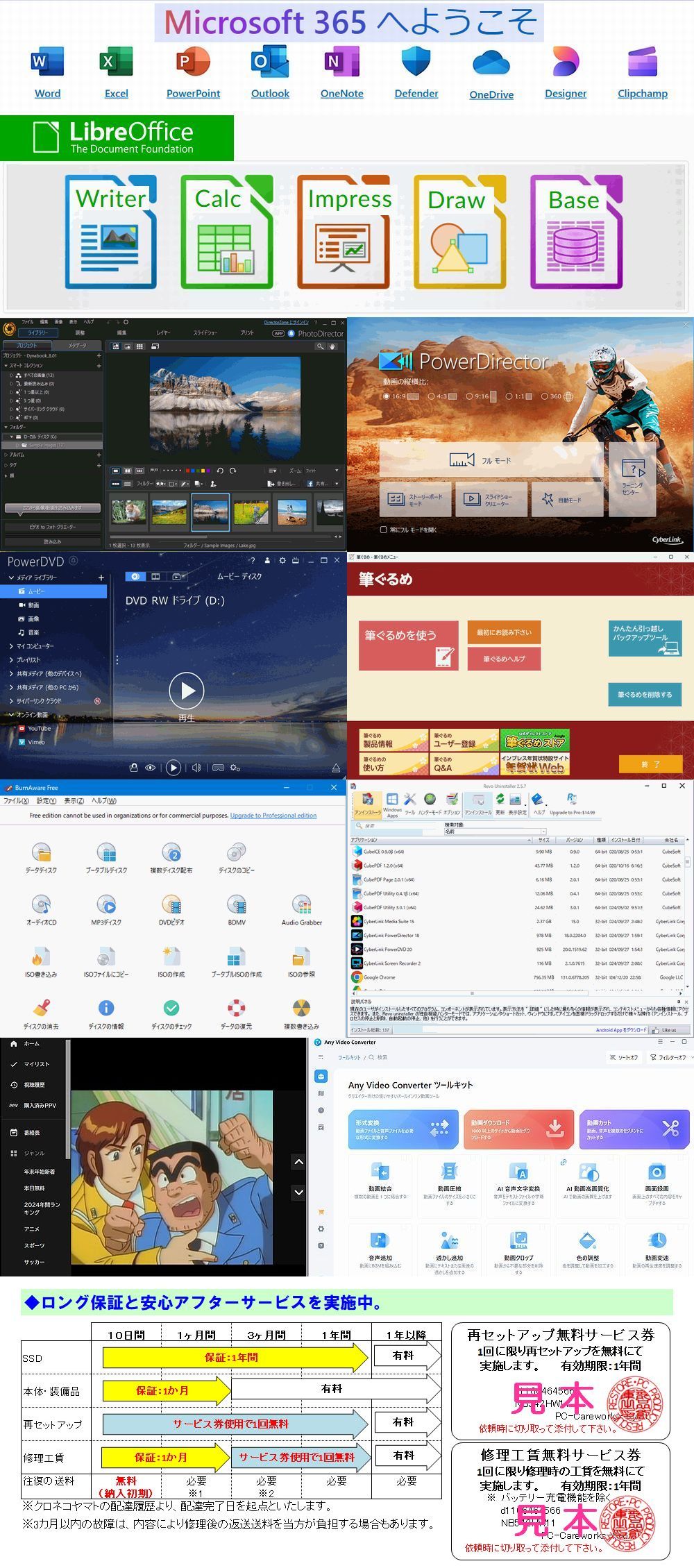◆多彩なソフトもセットアップ済。 ・【Microsoft365(Office WEB)】:無料のMicrosoft Officeソフト(Excel、Word、Power point、Outlook、他多数) ・【LIBRE Office】:officeソフト(文書作成、表計算、プレゼン、データベース)※Ms-Office互換対応 ・【CyberLink Media Suite OEM】:DVD、CD再生、写真編集、ムービー編集、オリジナル動画、オーサリング、他 ・【CyberLink ScreenRecorder】: スクリーンレコーダー機能。画面録画機能で超便利!!→詳細はこちらを 《クリック》 ・【筆ぐるめ】:年賀状作成や住所録作成ソフト ・【BurnAware】:BD-R、DVD-R/RWやDVD-RAM、CD-R/RWに全てが書き込み可能なソフト。 ・【Uninstaller】:アンインストールソフト(完全削除対応版) ・【Video Converter】:動画ダウンロード、ファイル変換も可能なソフト。 ・【Cube Soft】:pdfファイルの作成・連結など高機能処理も可能なソフト ・【VLC media player】:動画ファイル再生、DVD、CD再生対応ソフト。 ・【インターネットテレビ】:30チャンネル以上!話題の動画を無料で楽しめる新しい未来のテレビ。ニュースやアニメ、スポーツなど、多彩な番組をお楽しみいただけます。 ・この他にもLINE、iTunes、Windows Media Player、Google Chrome、Firefox など 主要ソフトは導入済み。 ※ソフトの「マニュアル」も収録済。不要な同時インストールソフト はありません。(不要な場合は完全アンインストール可能。) ![]() |