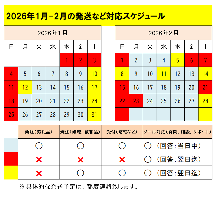 | 注意事項 | ・動作確認後に取引ナビにて、必ず『受取連絡』をお願いします。 ・過去の評価および取引内容によっては、入札を取り消す場合があります。 ・決済は、Yahooかんたん決済のみです。 決済期限経過後は決済不能により、自動的に「落札者都合の取り消し」となります。 ・受け取り後にインストールされたソフト、外部機器の接続についての問い合わせには対応できません。 ・説明に記載のスペックにて動作保証致します。(当方への入荷前の履歴などは保証適用外となります。) ・評価につきましては、ご評価頂いた場合に返信の形で数週間の間に評価致します。 |