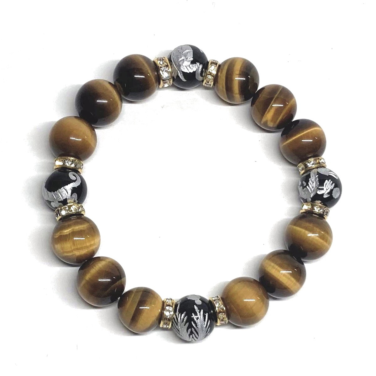 こちらは、四神獣銀彫オニキとタイガーアイを組み合わせたパワーストーンブレスレットです。四神獣は、中国の伝説で4つの方向(東西南北)を守護する神聖な神。四神獣、厄災から身を守り、多くの運気を呼び込むと言われております。石大きさは程よくインパクトのある12mm玉で内周 約17cmです。 数に限りがございますので気になる方はお早めにどうぞ。