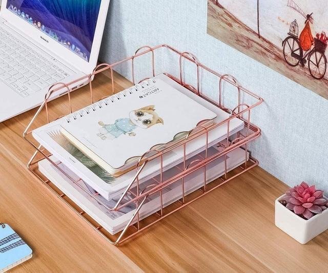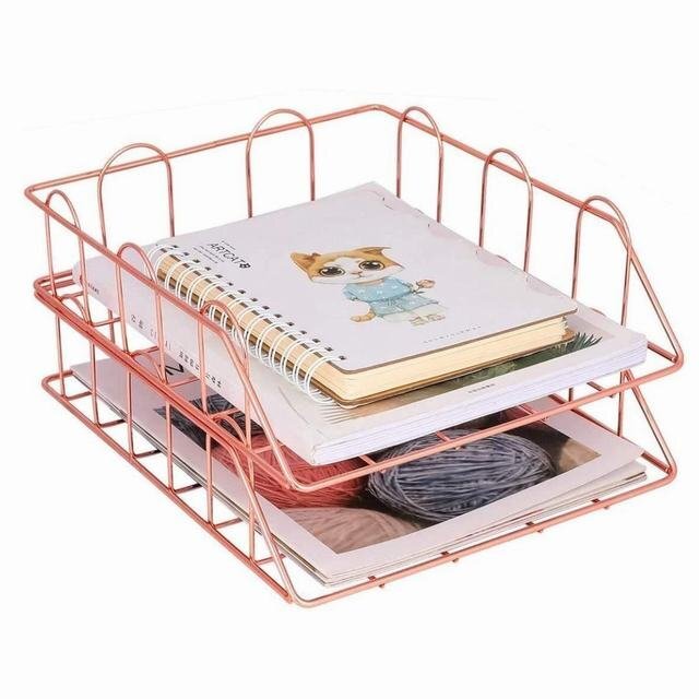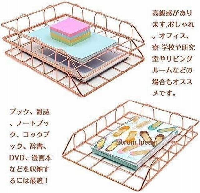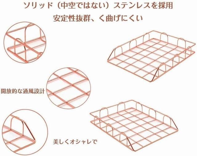 "【丈夫なスチール製から長持ち】 素材は耐衝撃性に優れたスチールで出来ているので、何年も愛用できます。 ロースゴールドメッキ加工も施されているのでおしゃれで錆が防止でき、ホコリで汚れにくくなっています。 【収納能力すごいレタートレー】 ファイルや封筒などを種類別に分け、デスクや棚に並べて使うのに最適なレタートレー2段です。 オフィスで使用頻度の高いA4クリアファイルがすっぽり入ります。郵便物や伝票整理、小物収納などにもご活用いただけます。 【分けても重ねても使える2段トレー】 トレーは縦に2段付いています。安定感のある脚でしっかりと支えます。 2段タイプですがトレーを分けて使ってもいいです。上に積み重ねることもでき、スペースを有効活用でき、机や棚がスッキリと片付きます。 【おしゃれに収納】 特別なロースゴールドはとても綺麗です。 お部屋に合わせやすいシンプルでスタイリッシュなデザイン。 ディスプレイ棚としても利用できる、シンプルでおしゃれなデザイン。 小物をすっきり整理整頓でき、飾るように収納できます。"