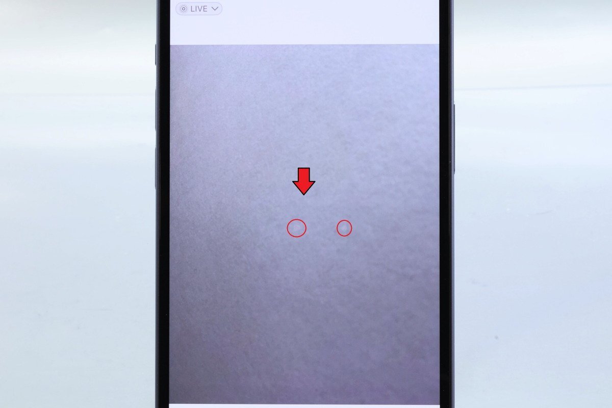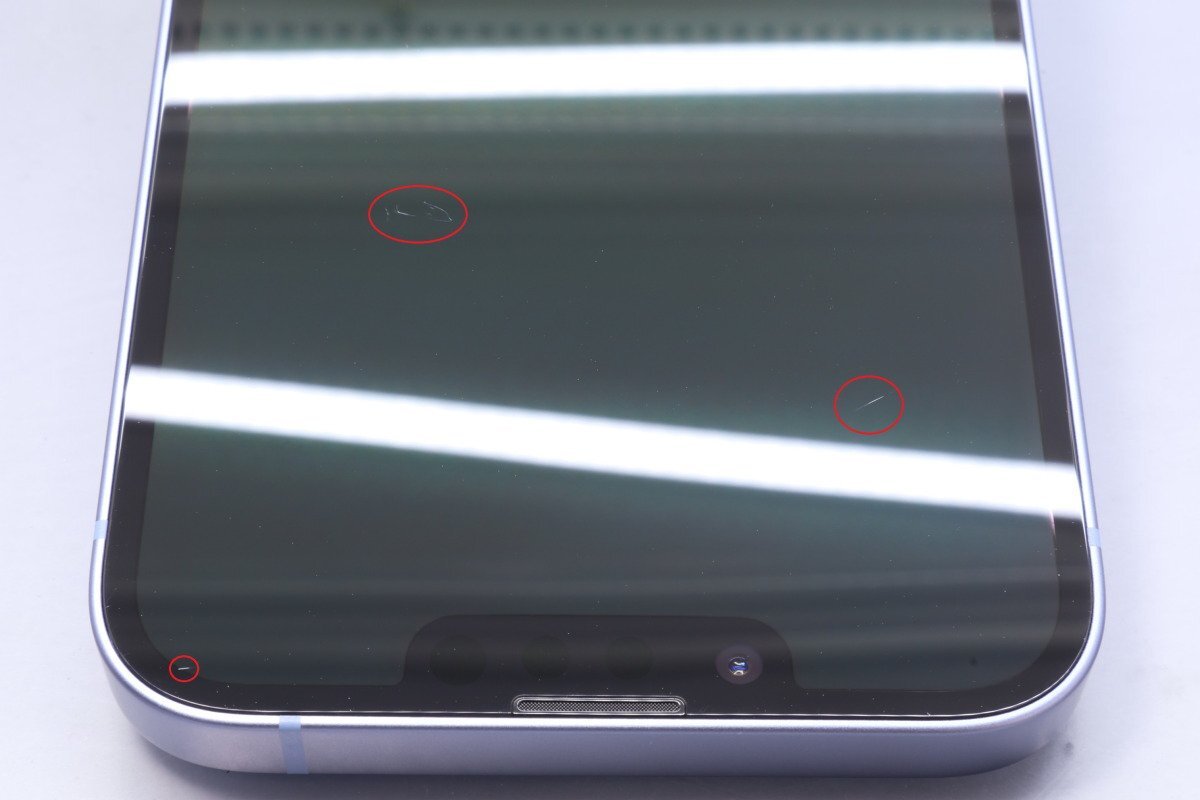 ■特記事項 : インカメラ撮影時、写真ともに横に光のライン(赤矢印)と薄いピンク色の点(赤丸)が写り込みます(写真6 ※インカメラで撮影した写真を撮影してます) 画面キズ(写真7)
